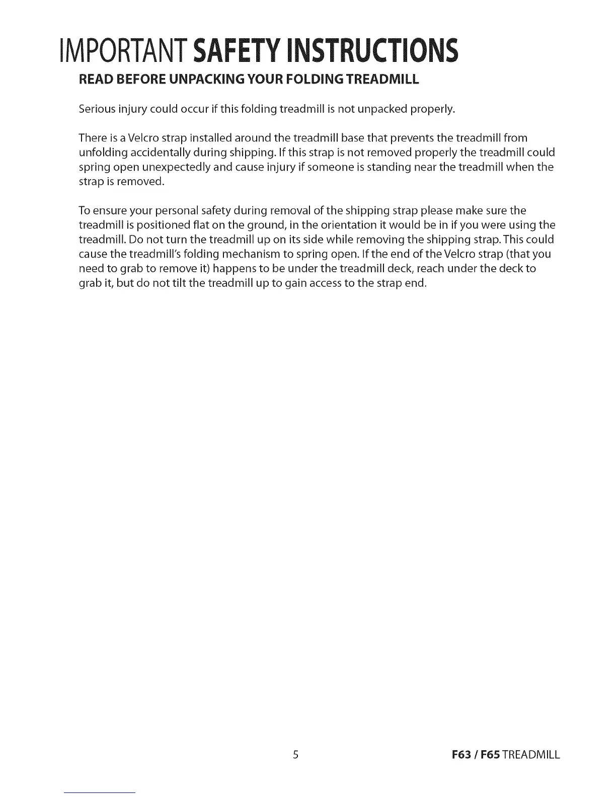treadmill. Do not turn the treadmill up on its side while removing the shipping strap.This could