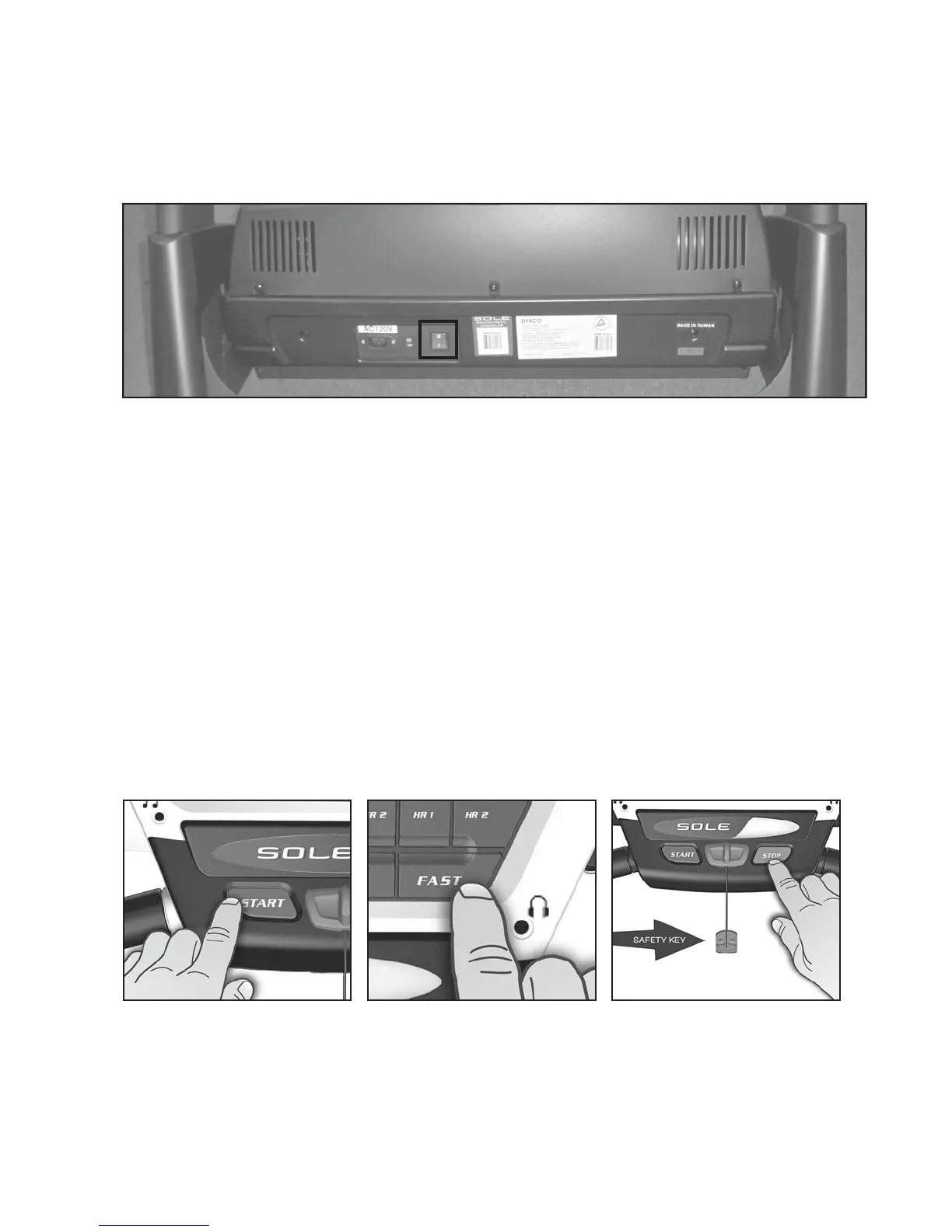 switch located at the front of the treadmill below the motor hood. Ensure that the Safety Key is
