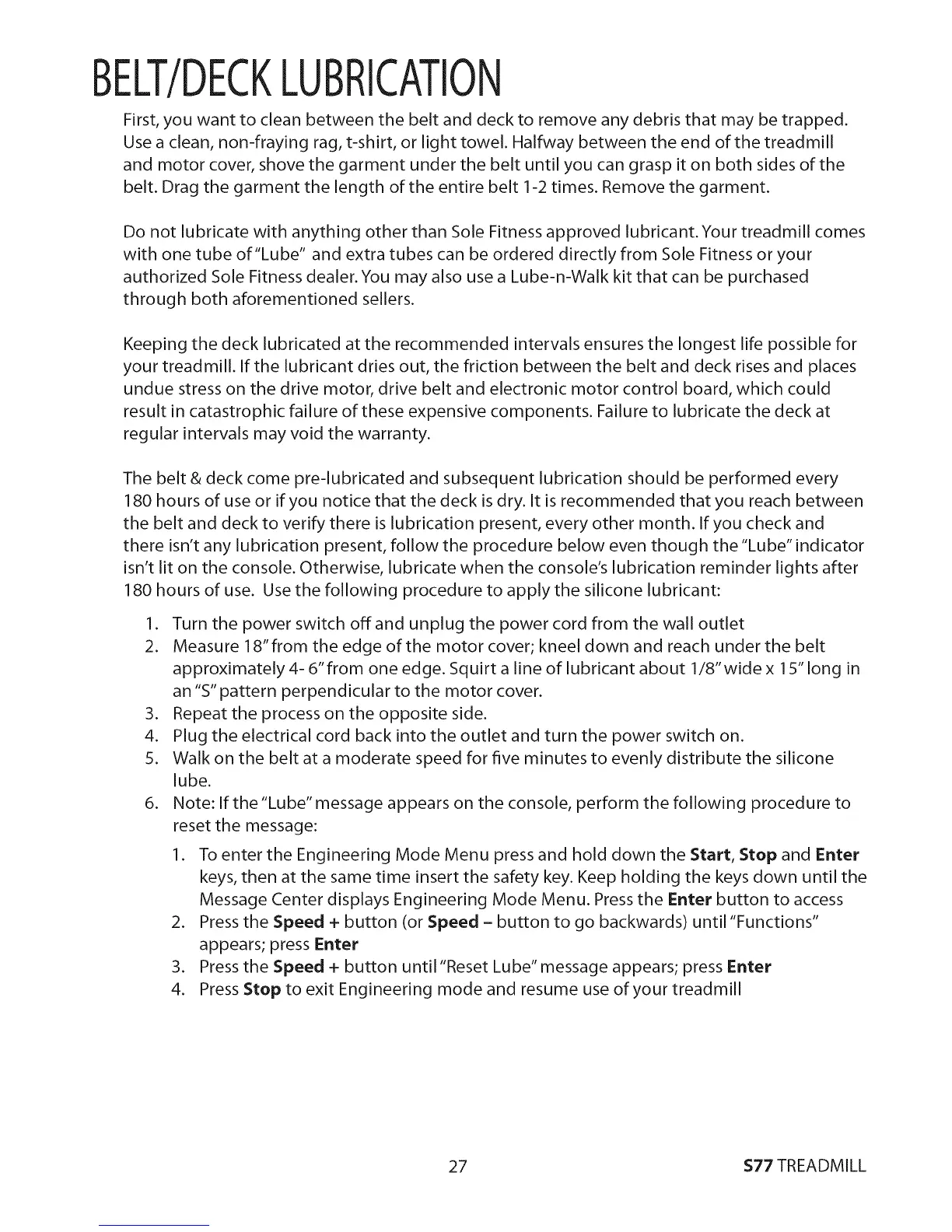 Do not lubricate with anything other than Sole Fitness approved lubricant.Your treadmill comes