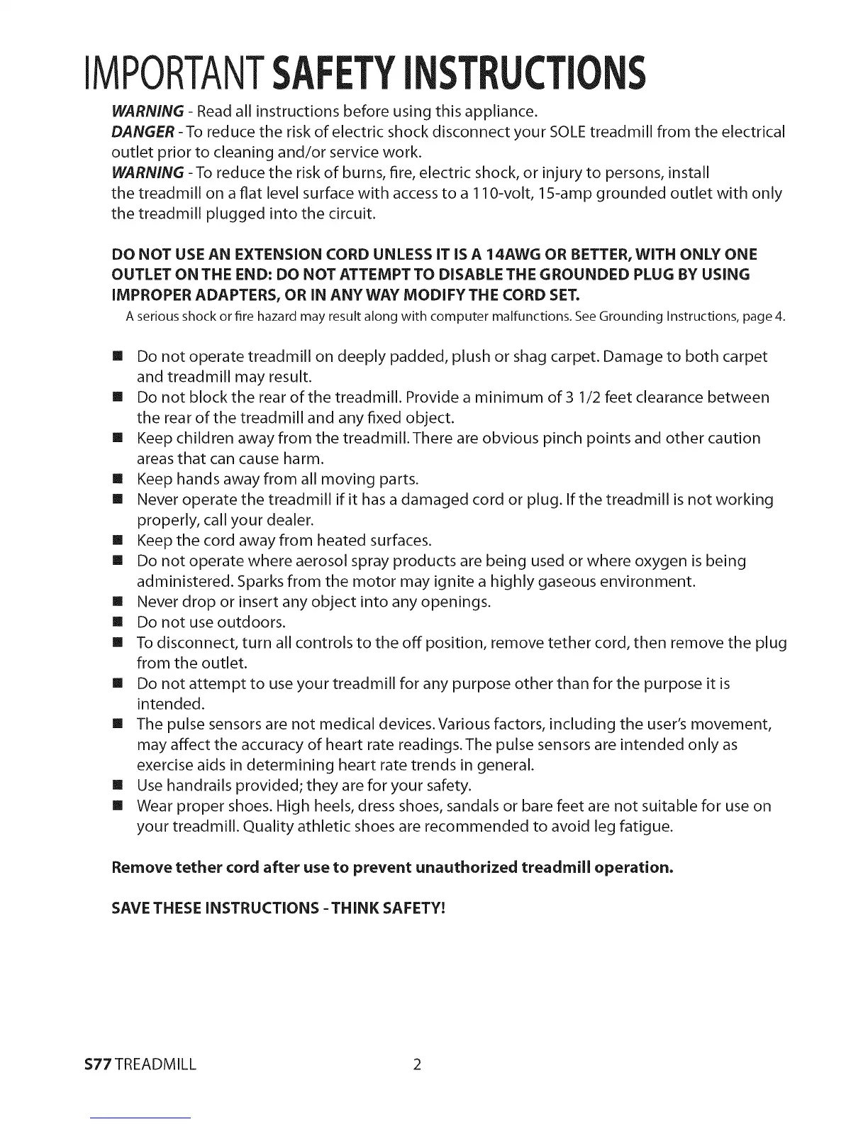 Remove tether cord after use to prevent unauthorized treadmill operation.