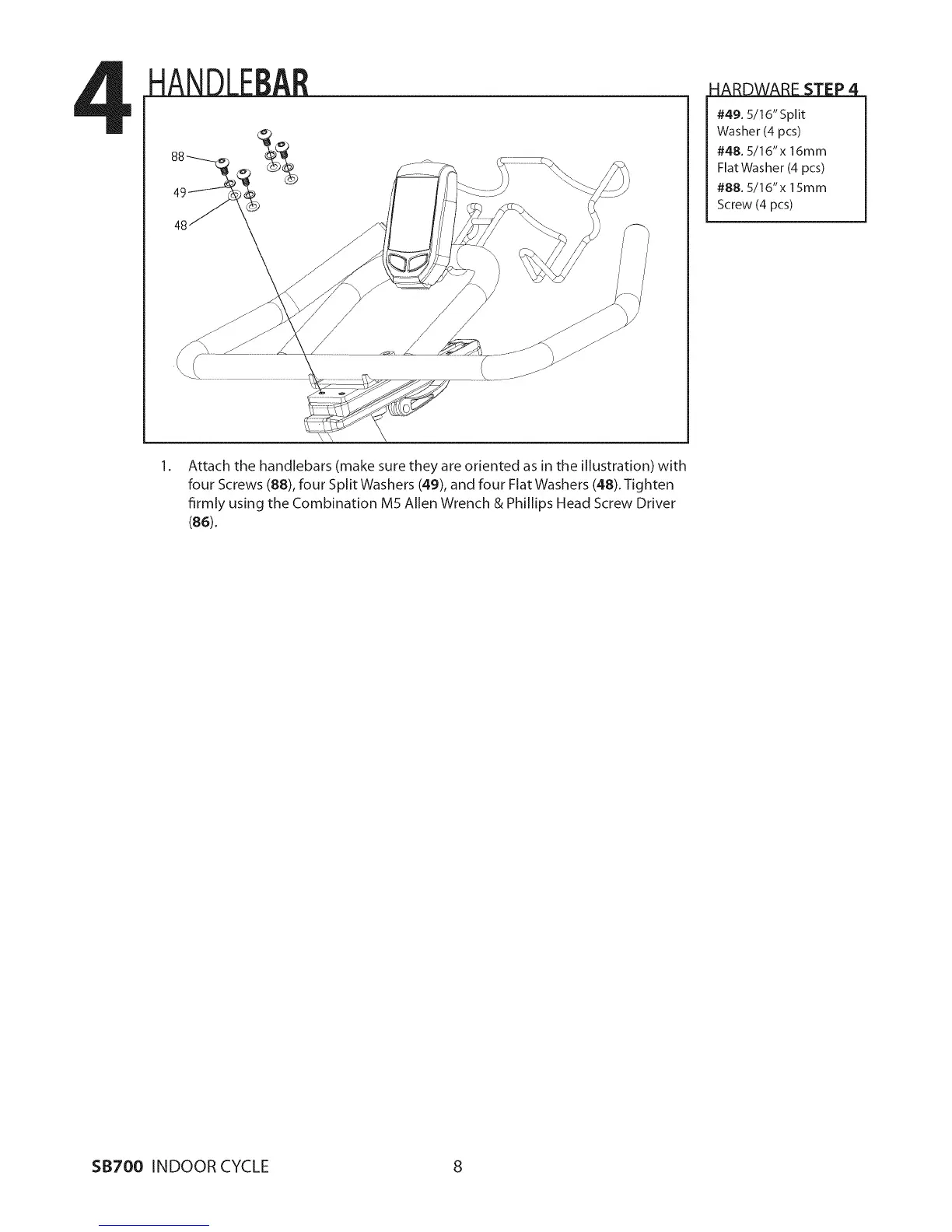 four Screws (88), four Split Washers (49), and four Flat Washers (48). Tighten