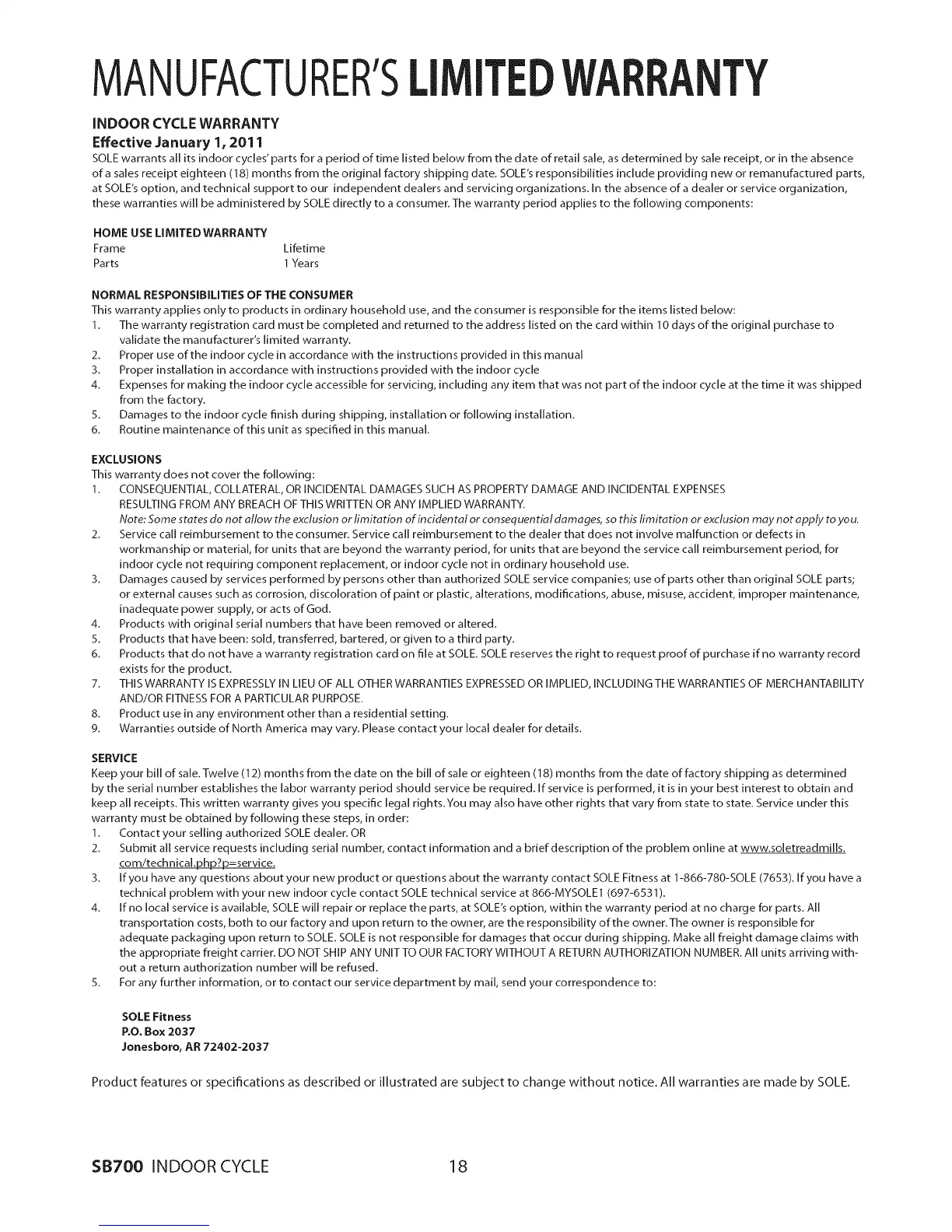 4. If no local service is available, SOLE will repair or replace the parts, at SOLE's option, within the warranty period at no charge for parts. All
