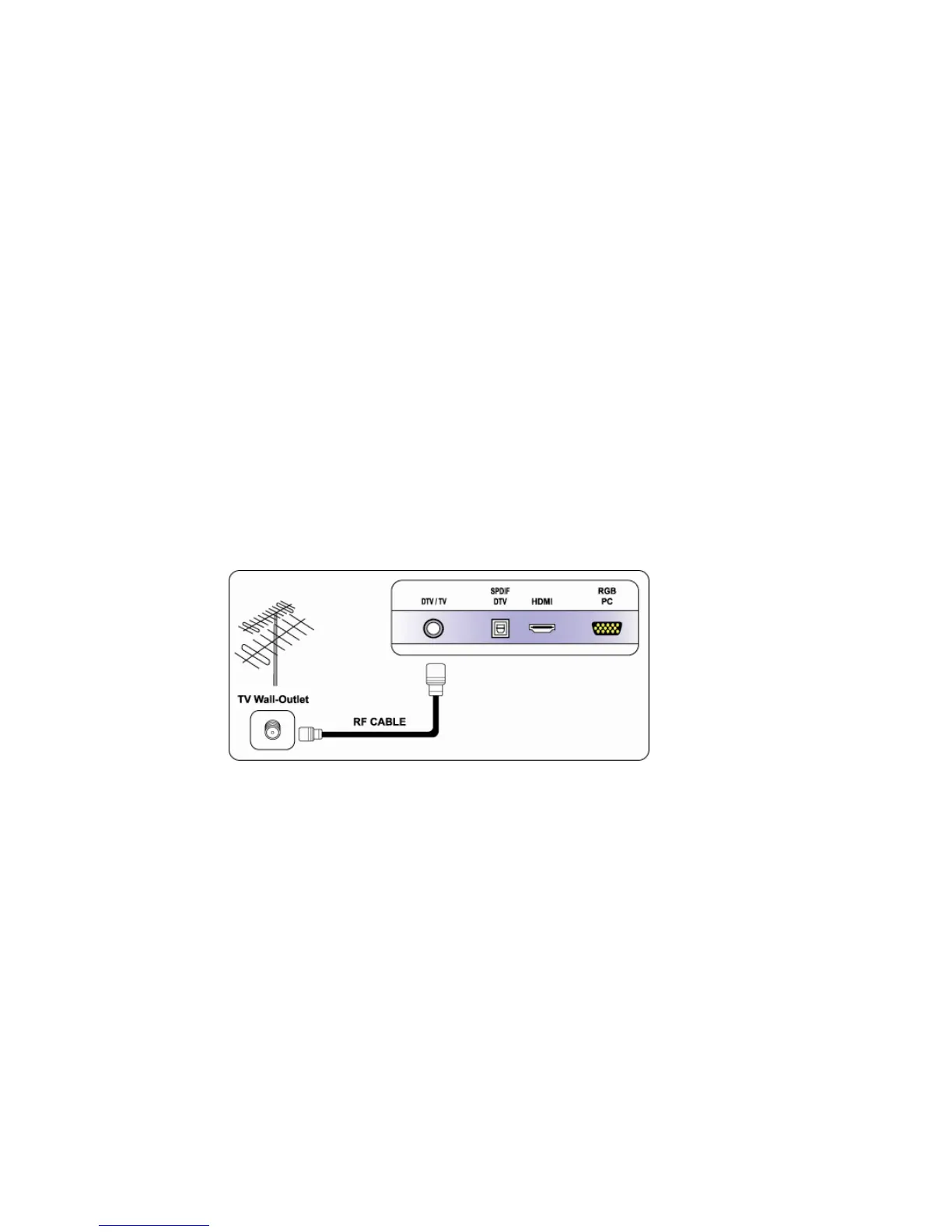 1. Connect RF cable to TV <ANTENNA> & <CABLE> input connector with an outdoor or wall outlet antenna output.