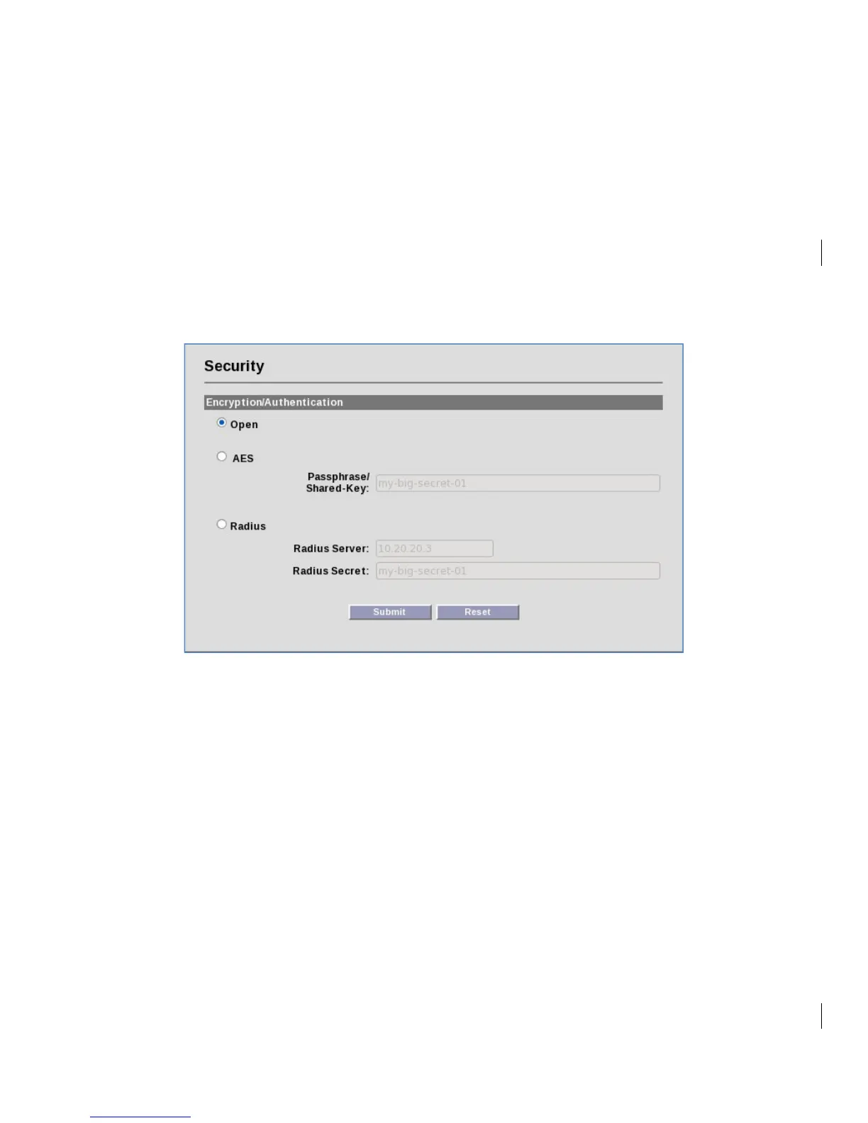 Three security options are available: Open, AES and Radius. All units on a wireless network must
