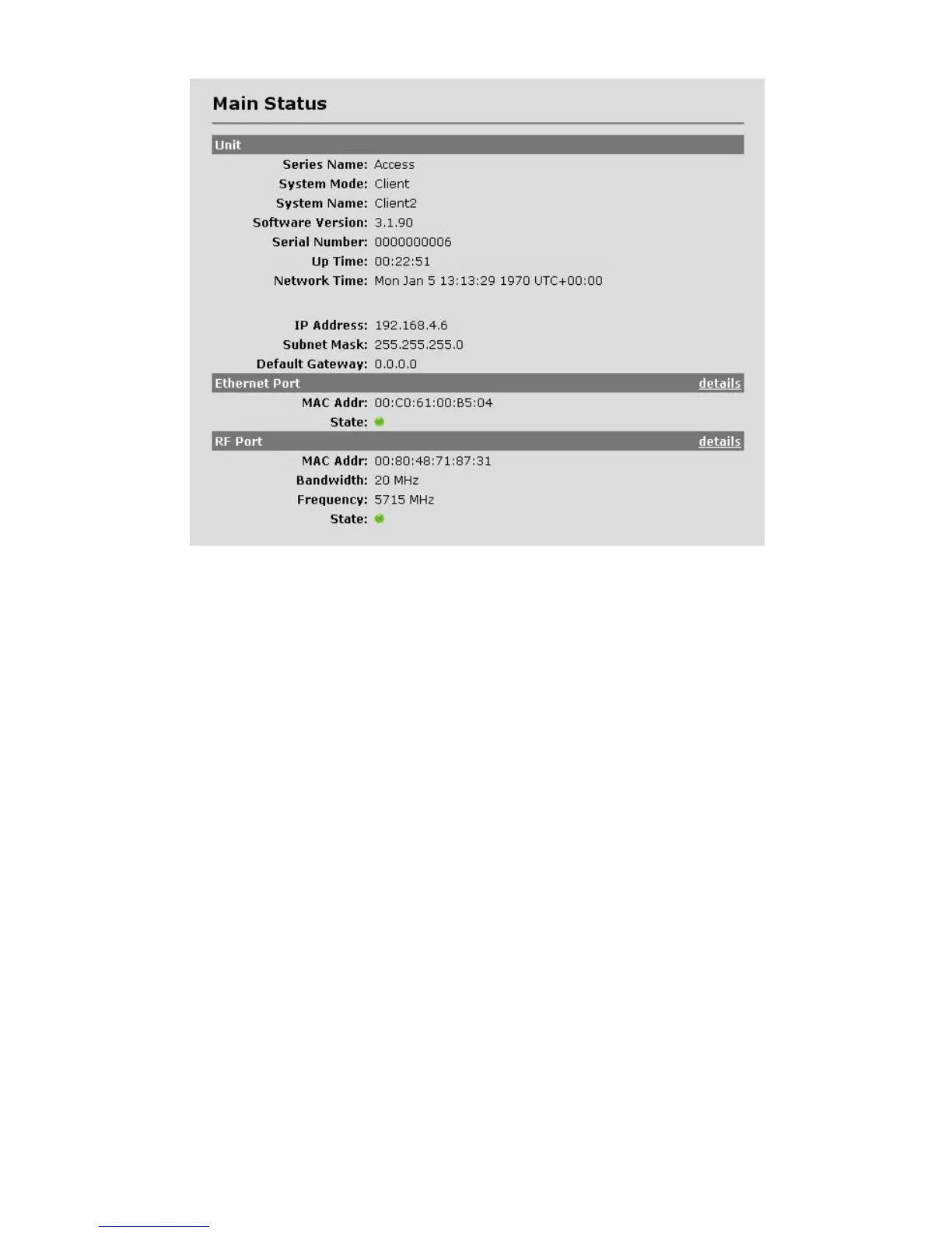 The functions of the Ethernet and RF Ports are similar to those at the base station. Clicking the