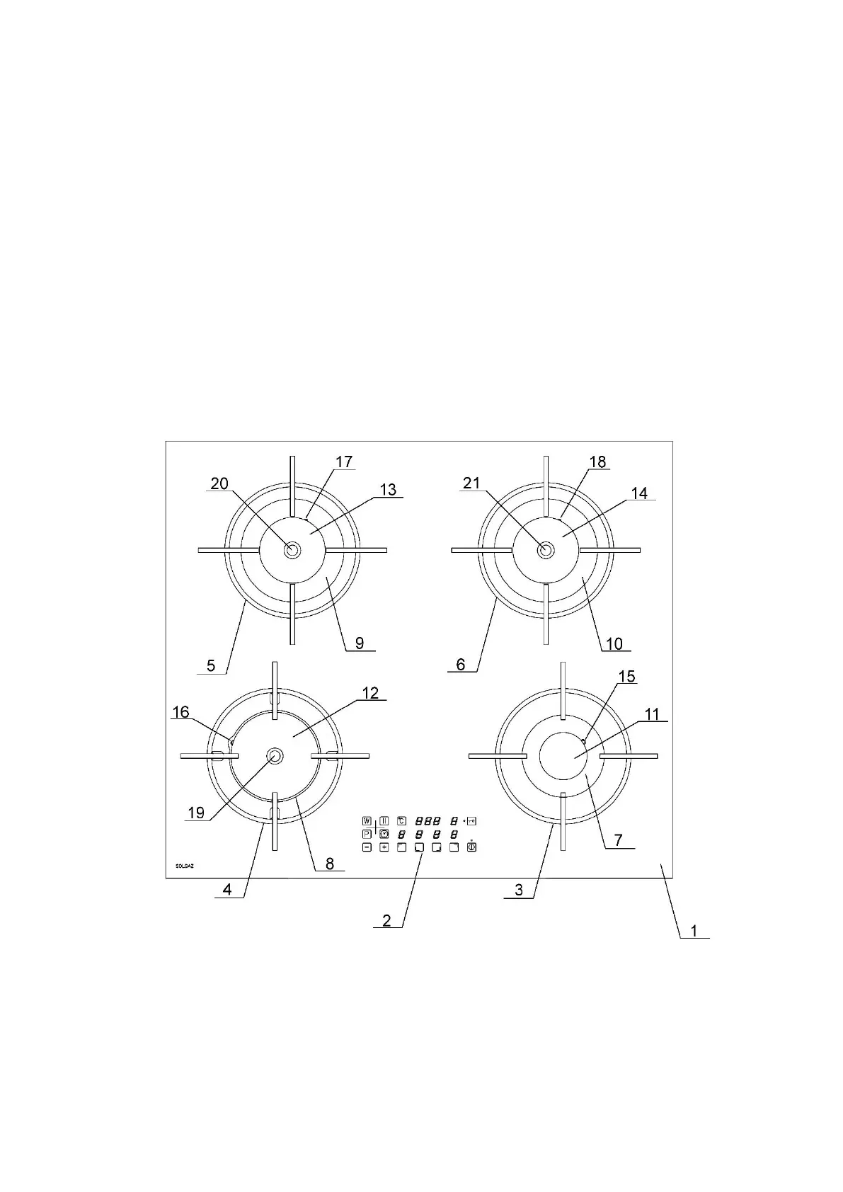 7, 8, 9, 10 – burner rings, 11, 12, 13, 14 – burner caps,
