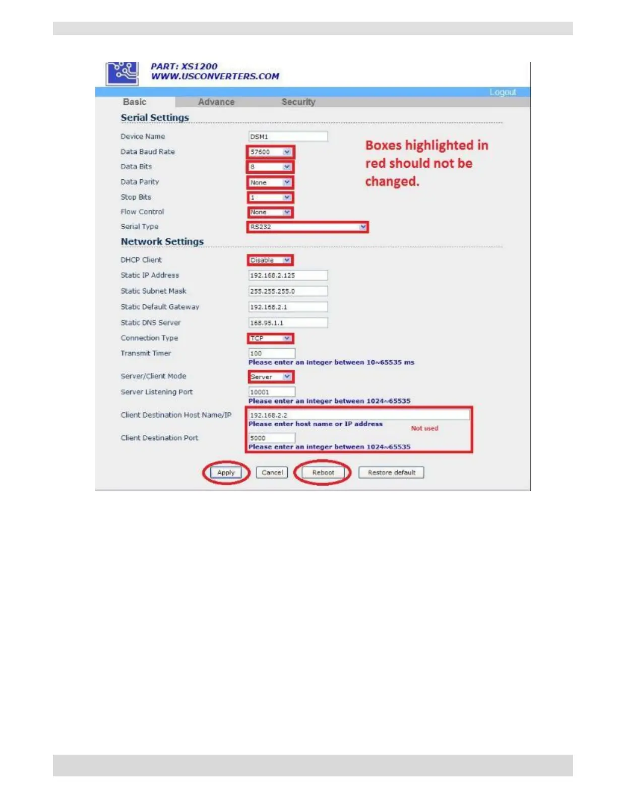 9. Click “Apply” then “Reboot” to save the new parameters.