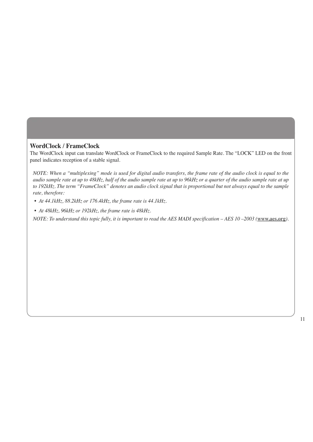 NOTE: When a “multiplexing” mode is used for digital audio transfers, the frame rate of the audio clock is equal to the