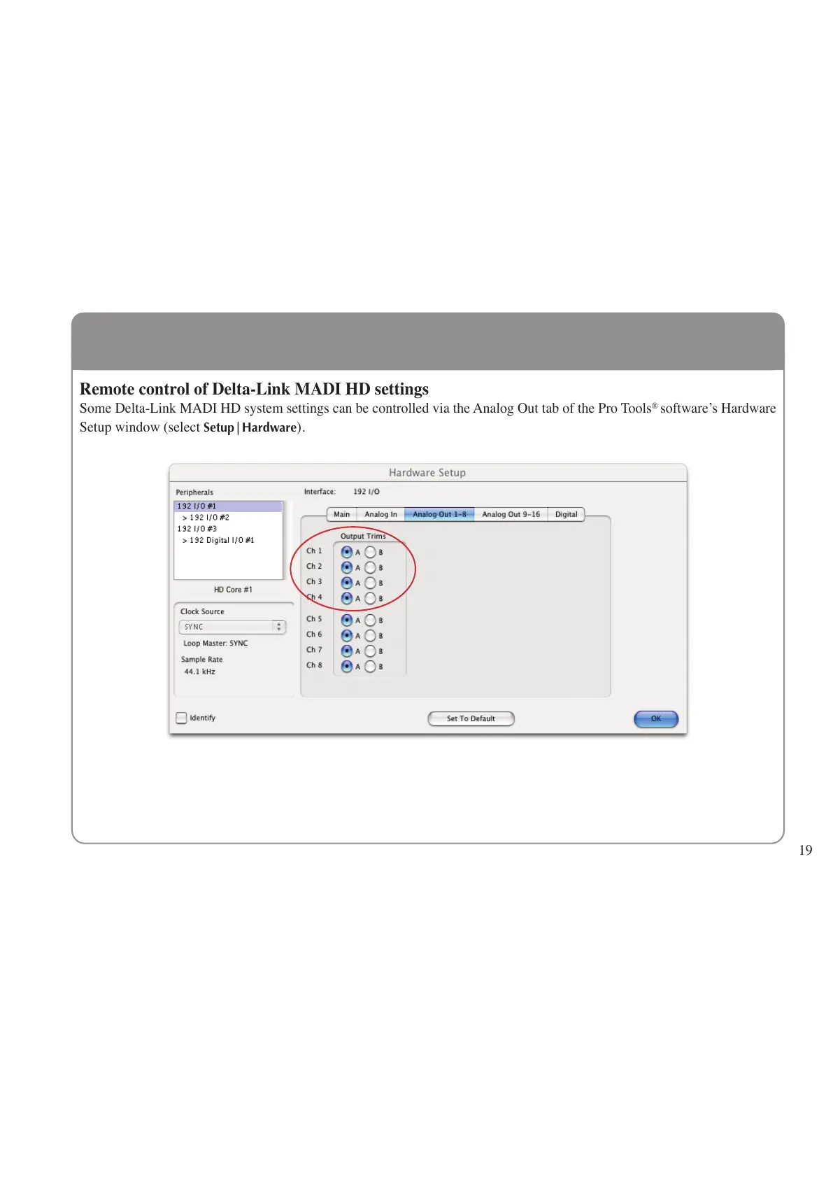 Some Delta-Link MADI HD system settings can be controlled via the Analog Out tab of the Pro Tools