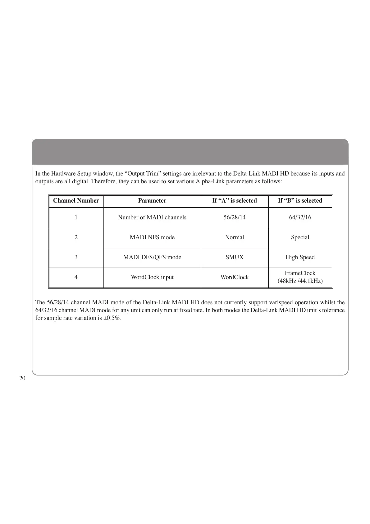 64/32/16 channel MADI mode for any unit can only run at fixed rate. In both modes the Delta-Link MADI HD unit’s tolerance