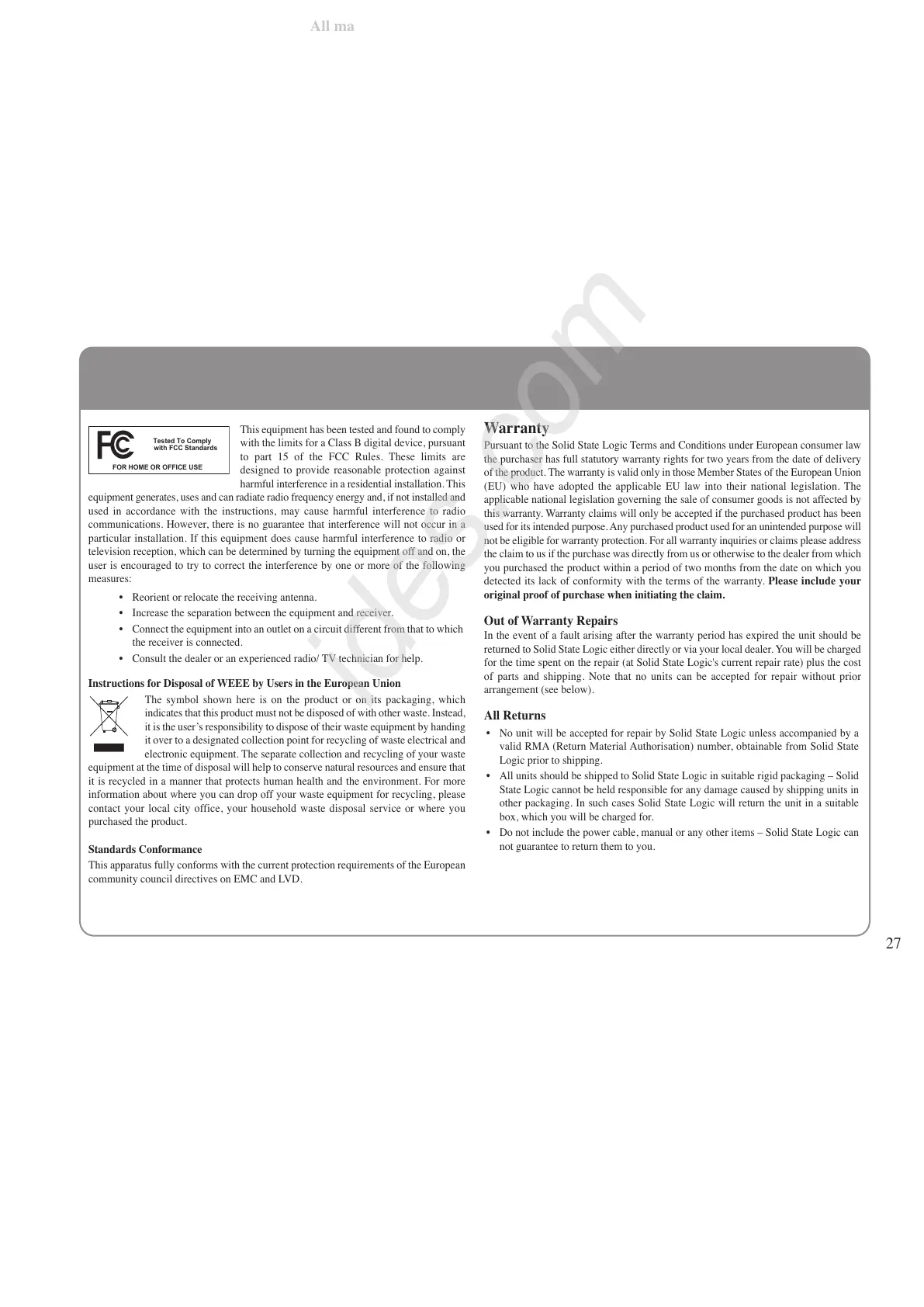 • No unit will be accepted for repair by Solid State Logic unless accompanied by a