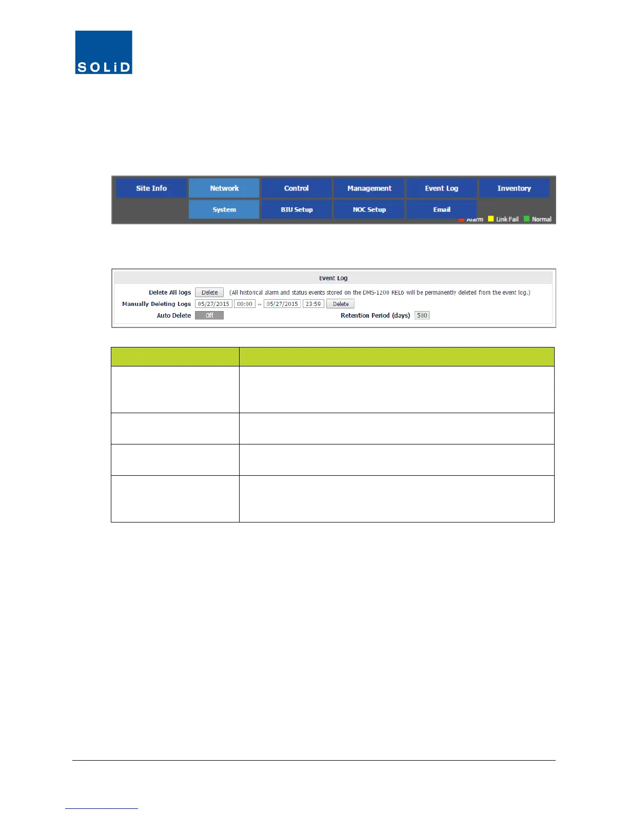 Using the Event Log settings, you can define how often the alarm and status logs are cleared.