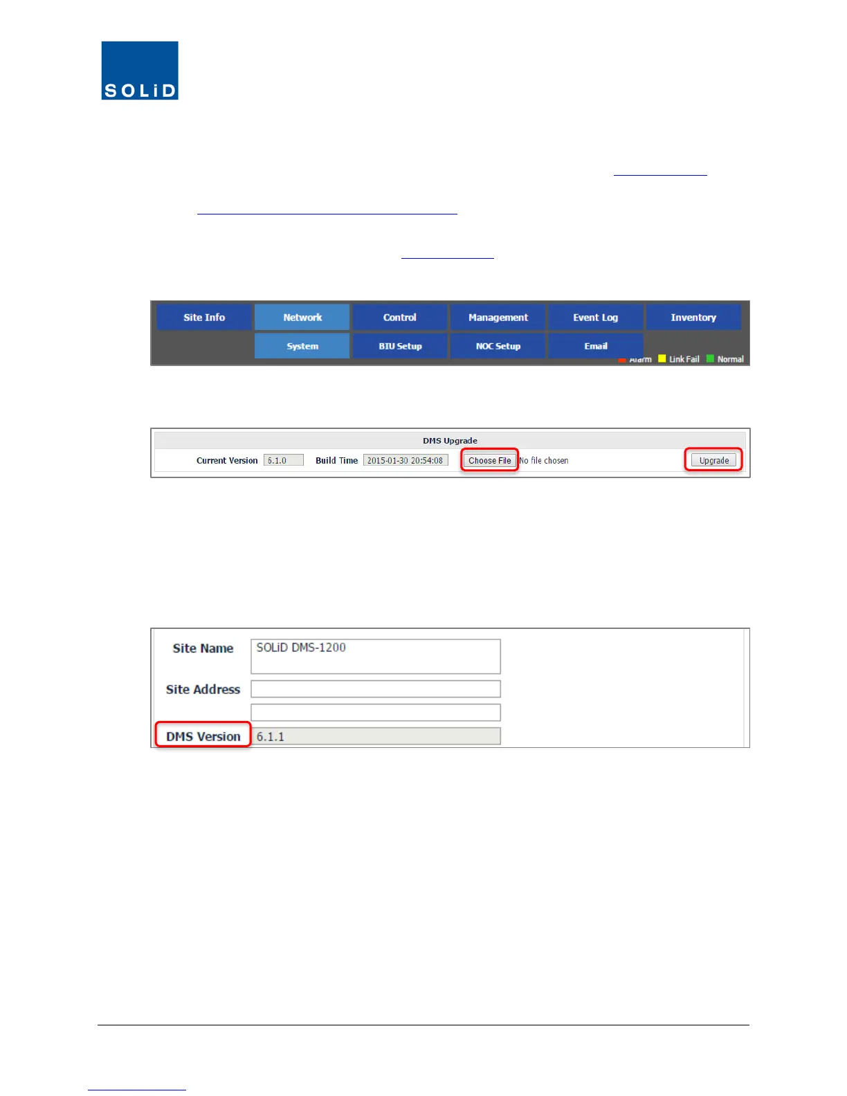 Periodic software upgrades are available for the DMS-1200 server. Contact SOLiD Support for