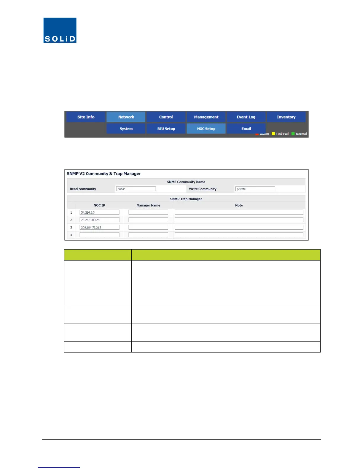 Table 4.7 – SNMP v2 Community and Trap Manager Settings