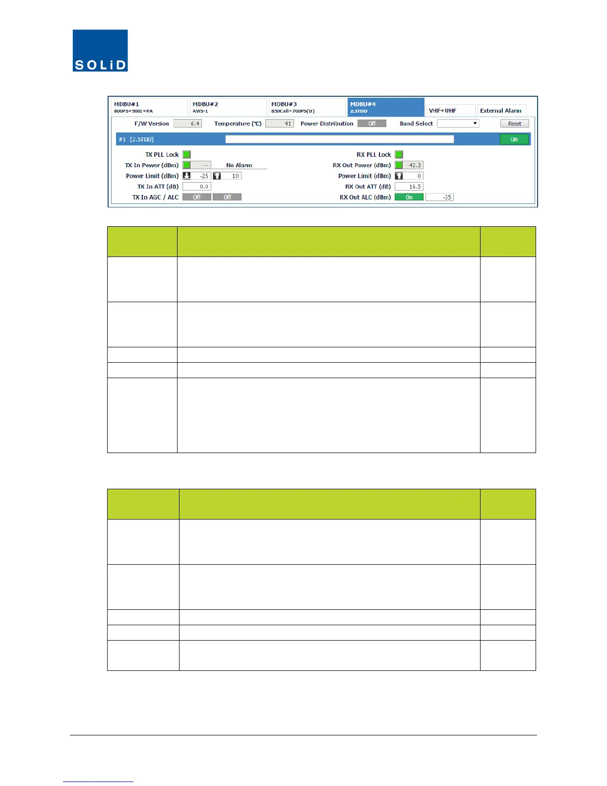 Tx In Power Shows Tx input power on that port (±2dB) and status: Green = within