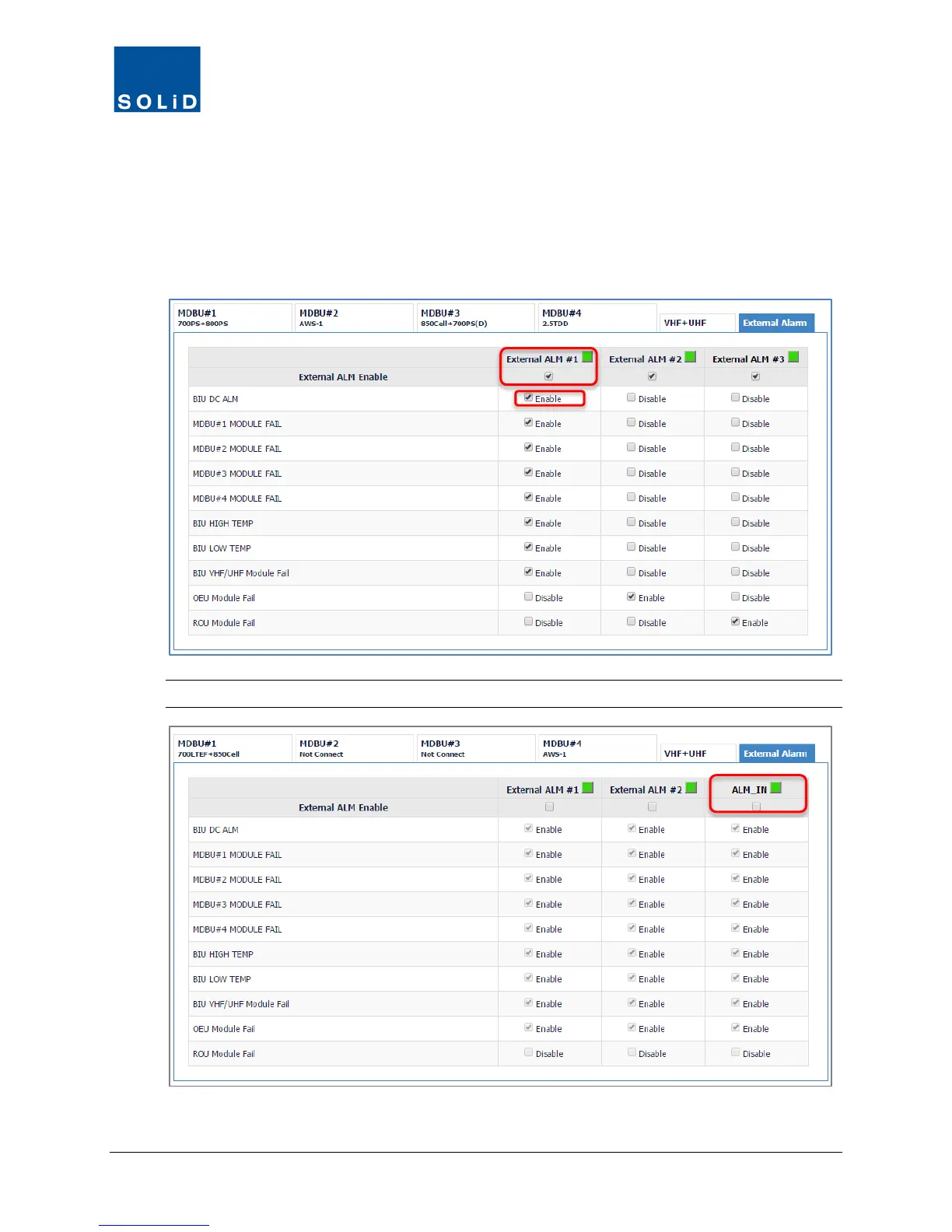 2. Check the External ALM Enable box if you want to activate contacts #1, #2, and/or #3.