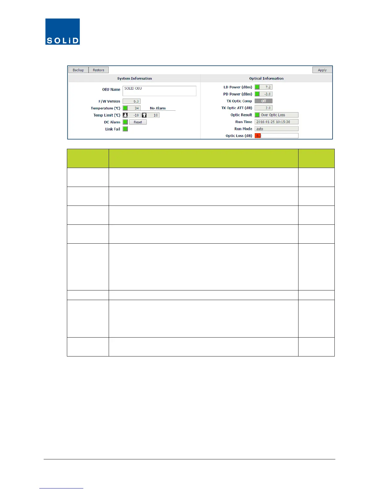 Table 7.8 – E-Optic Optical Information Setup Screen Fields
