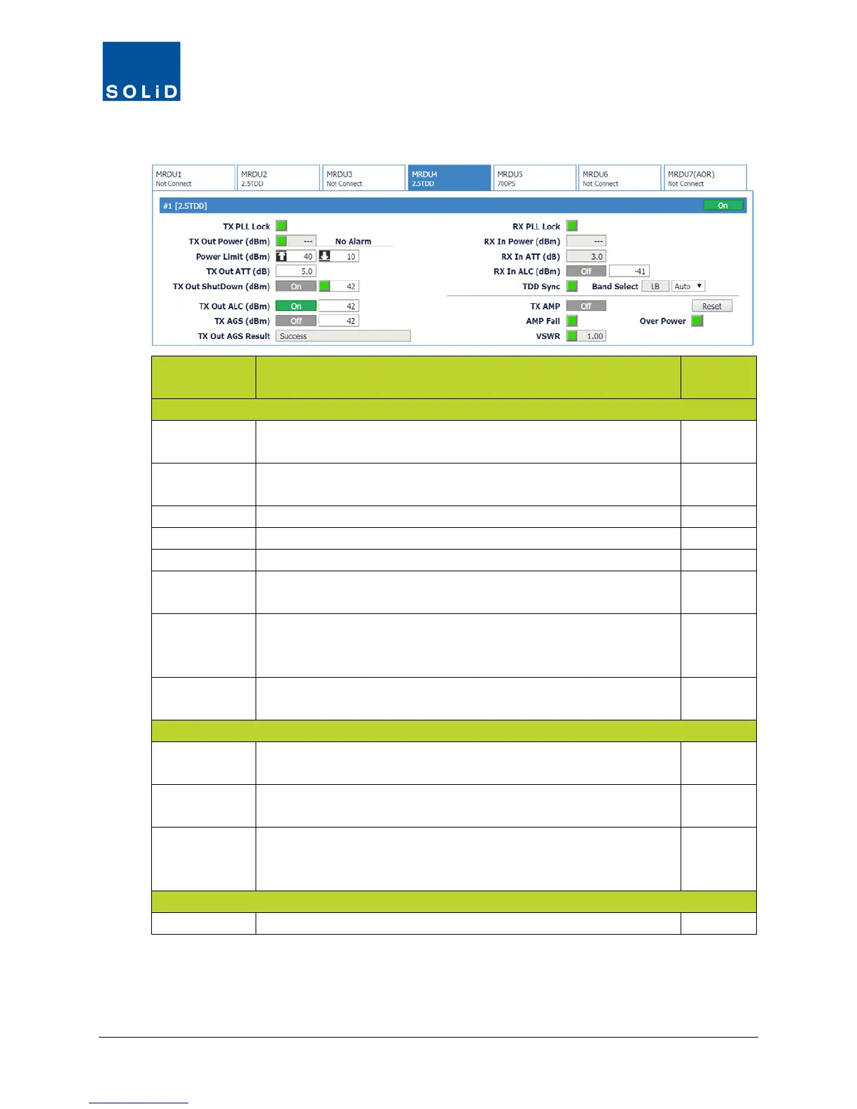 TDD Sync Shows status of SDM (Sync Detection Module). Green = normal.