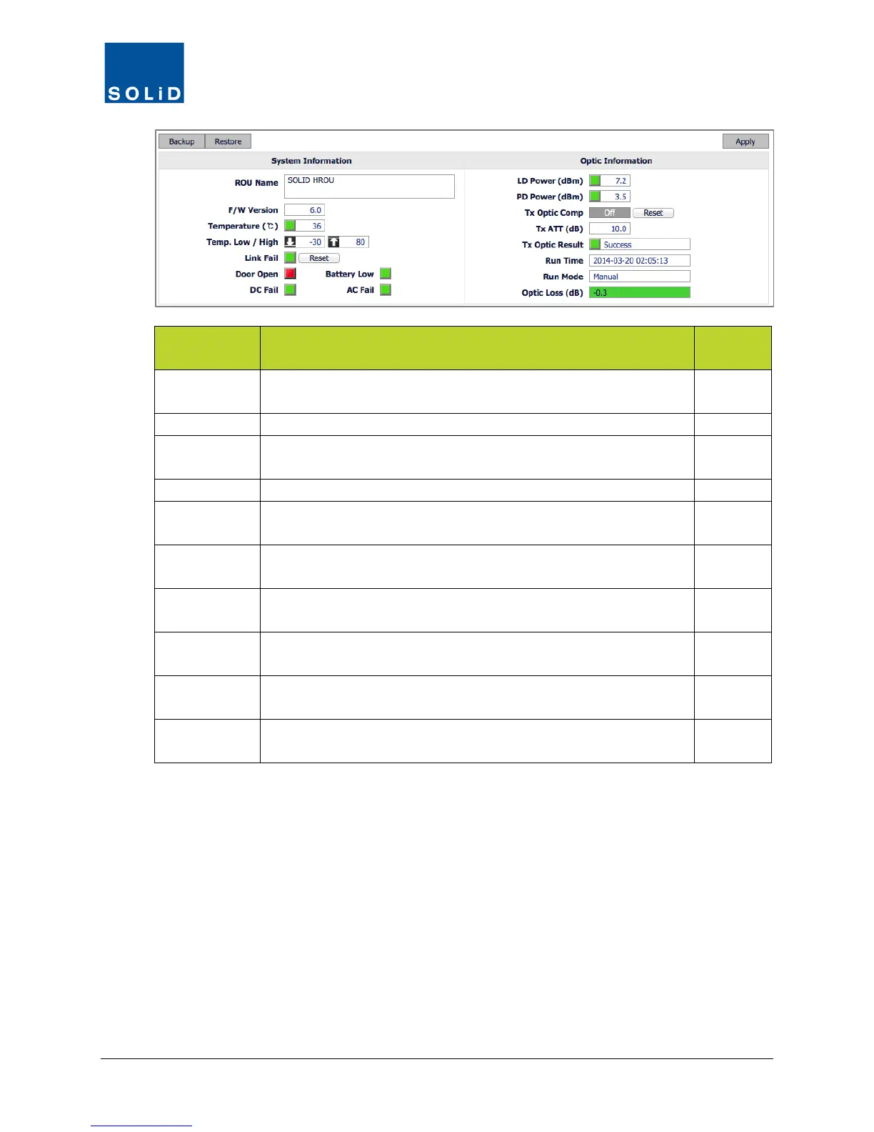 Temperature Current temperature of ROU. Also shows temperature alarm