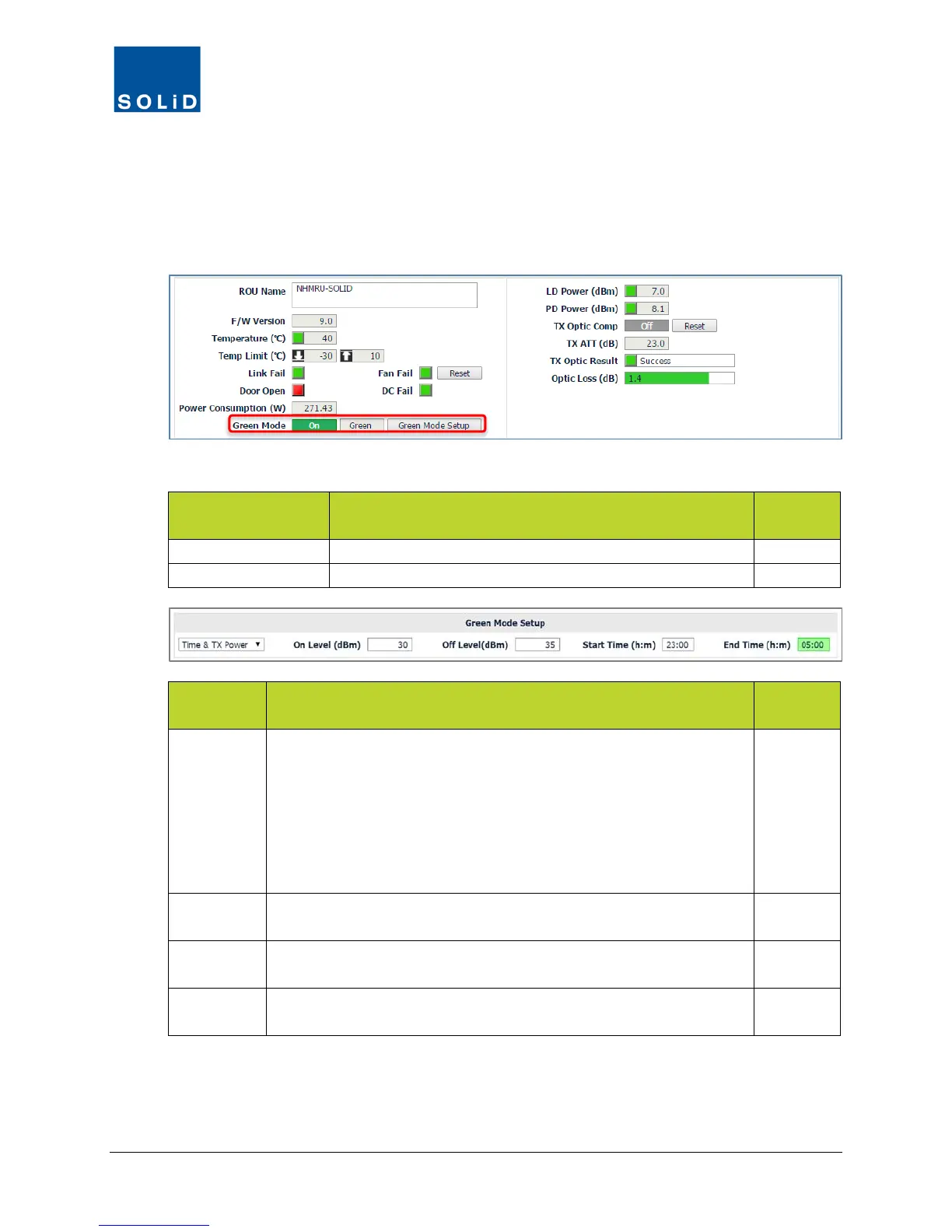 consumption. Green Mode can be activated by either time of day, TX power levels or both