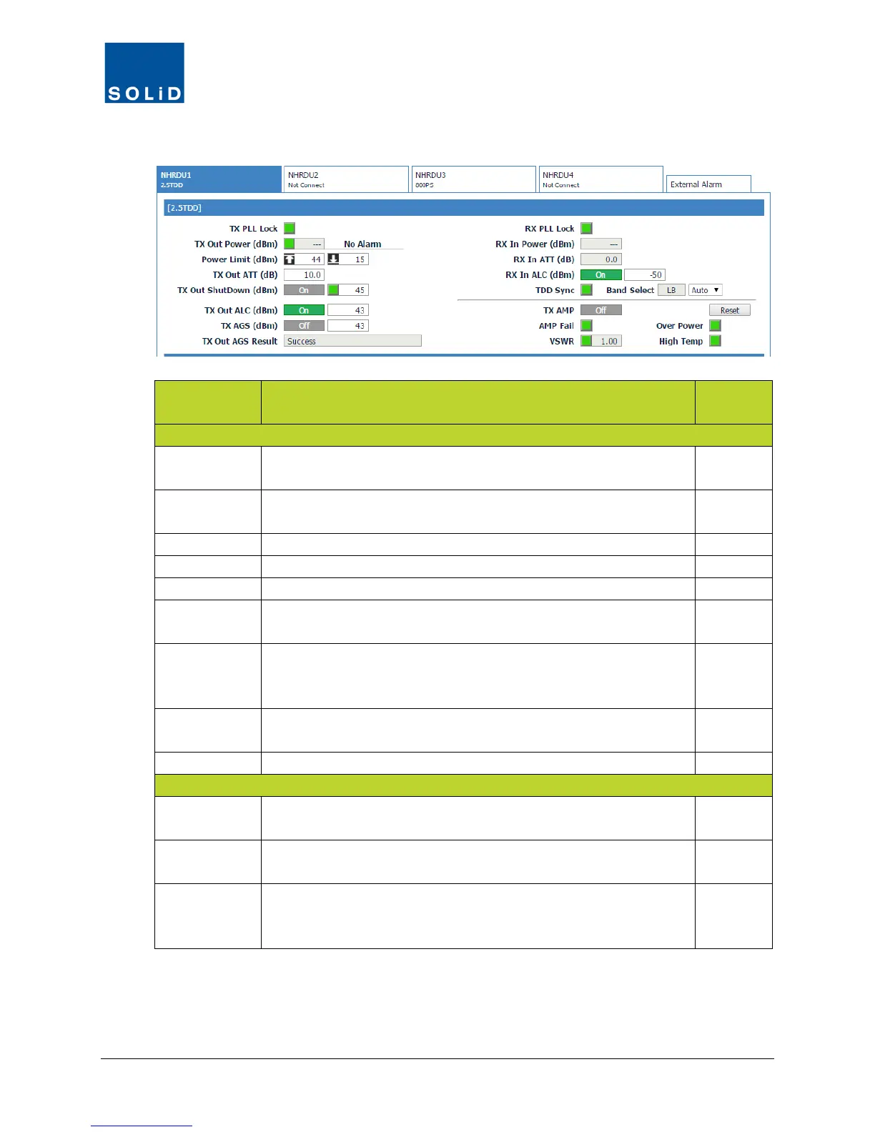 TDD Sync Shows status of SDM (Sync Detection Module). Green = normal.