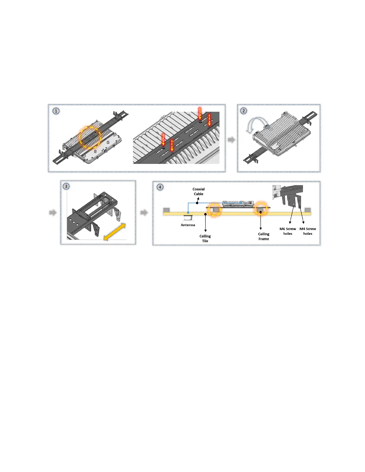 4. Tighten the ceiling frame with M4 and M6 screws in the screw hole of the ceiling mount.