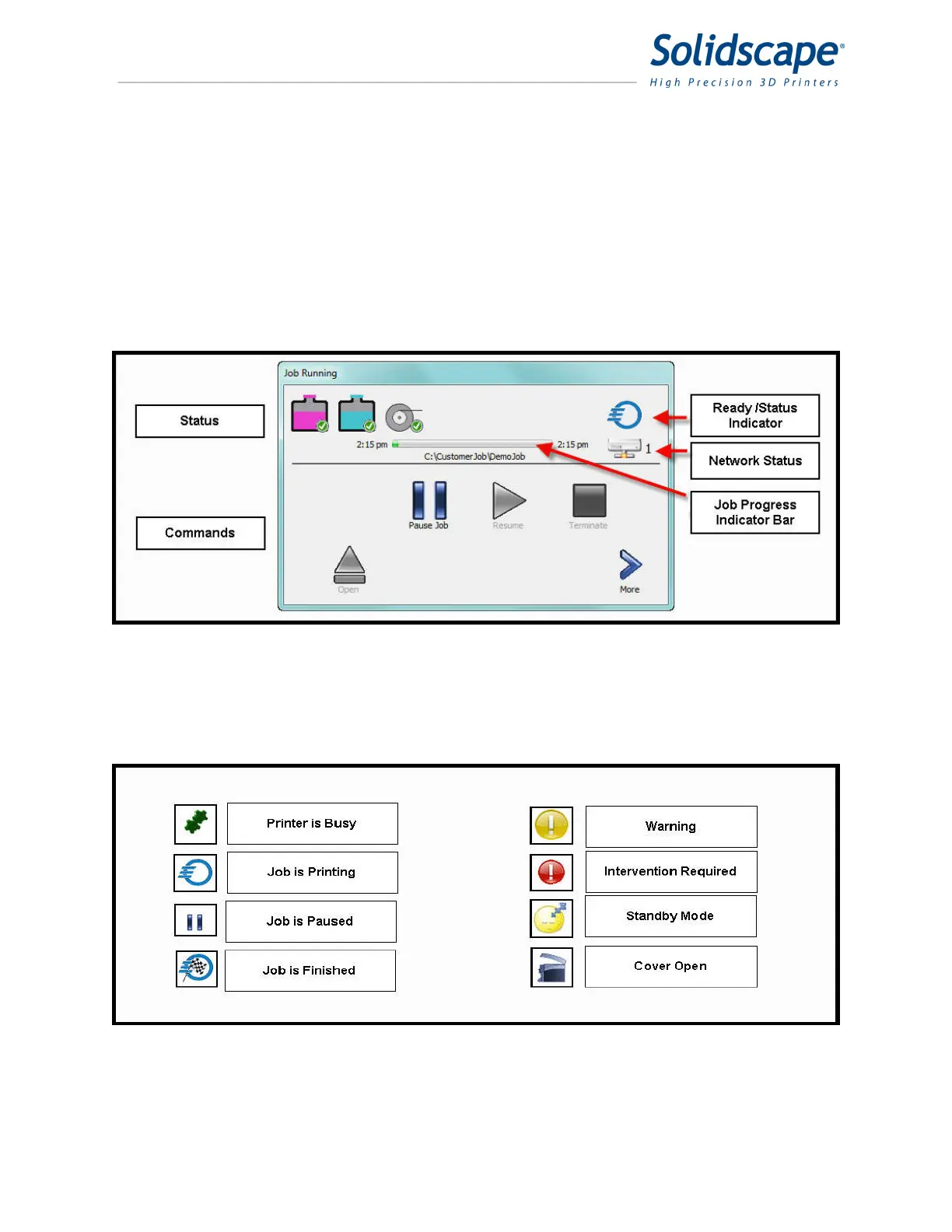 above the black line indicate the status of user responsible consumables, the job progress