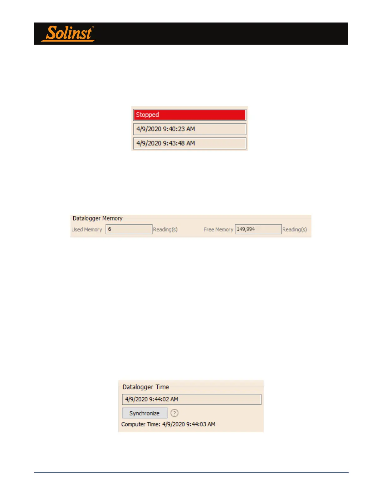the datalogger’s clock to the computer clock, click Synchronize to set the time in the Solinst datalogger.