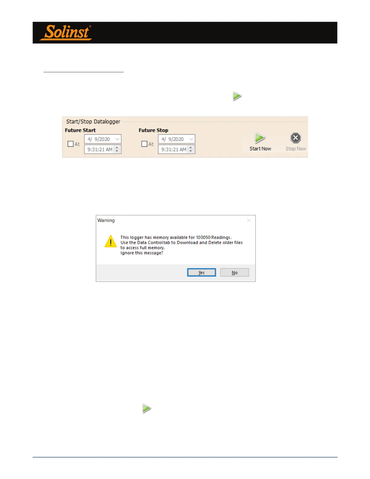 Selecting “Yes” ignores the message and starts the datalogger immediately with the remaining available