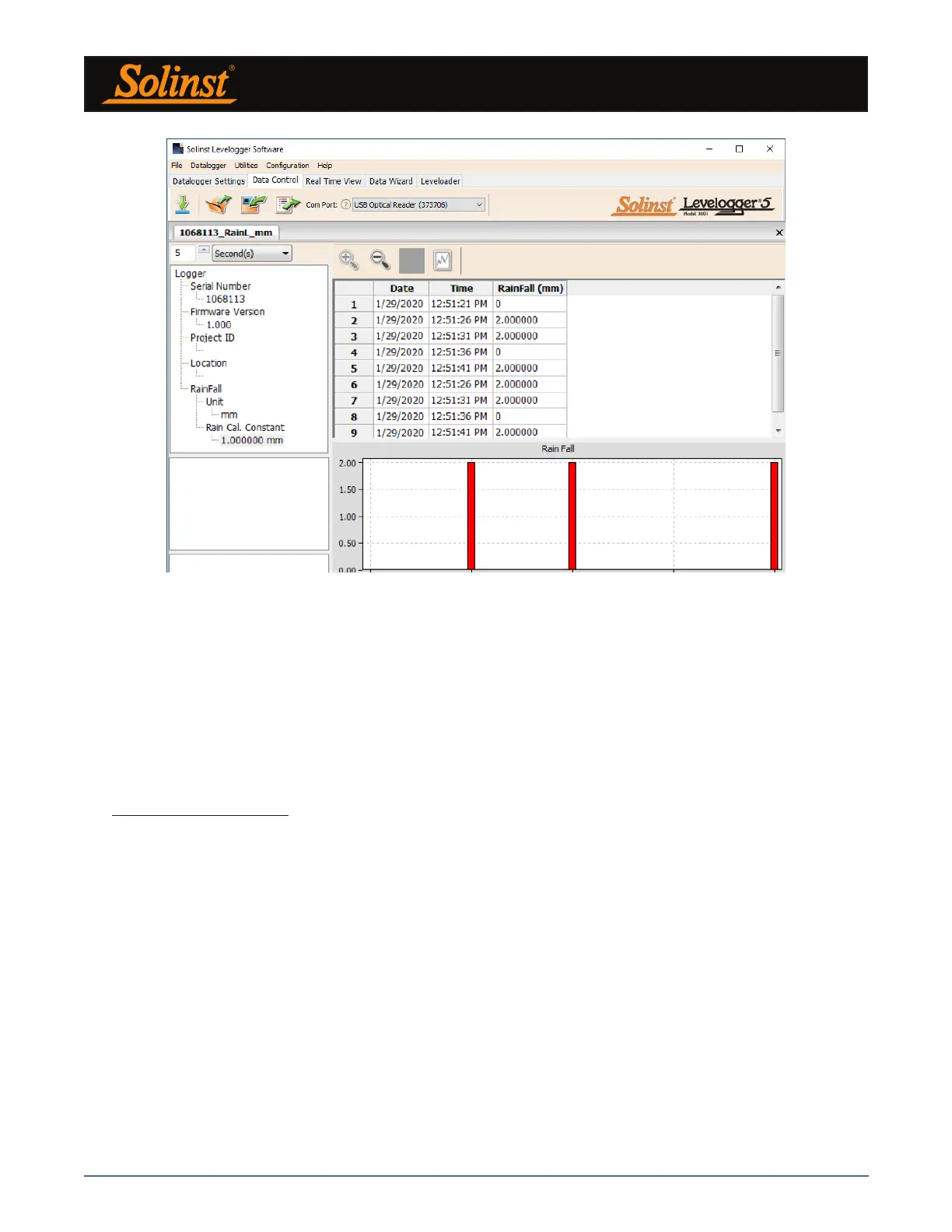 When you view data downloaded from a Rainlogger, the RainFall data will be shown in a table and in a bar