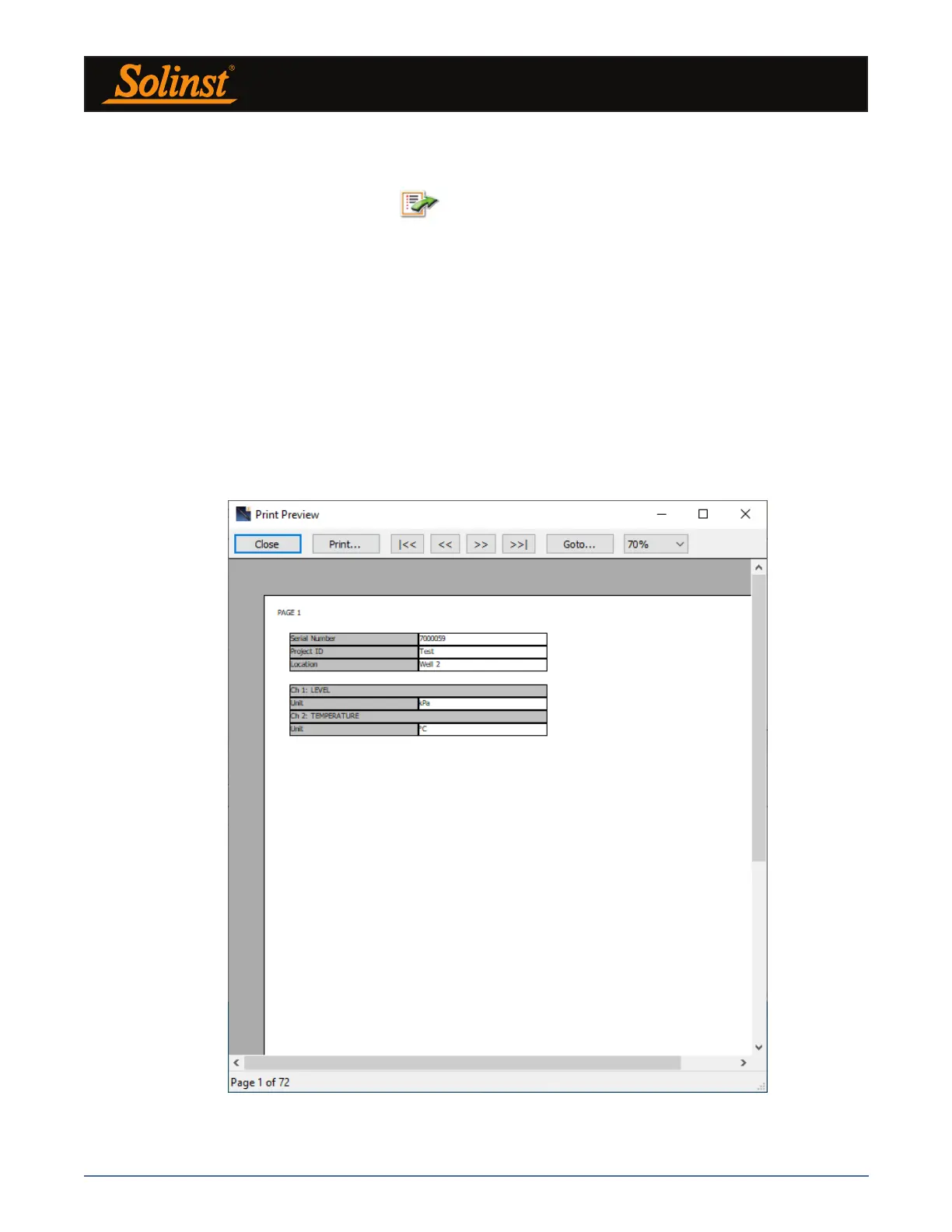 Print Preview window. Figure 7-10 shows the print preview of the Datalogger Settings. The Datalogger