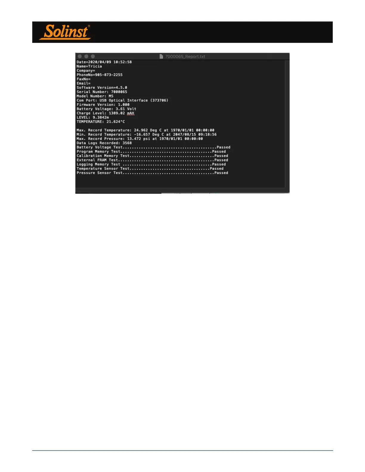 automatically attach the report to an email to send to Solinst Technical Staff for troubleshooting. If you are