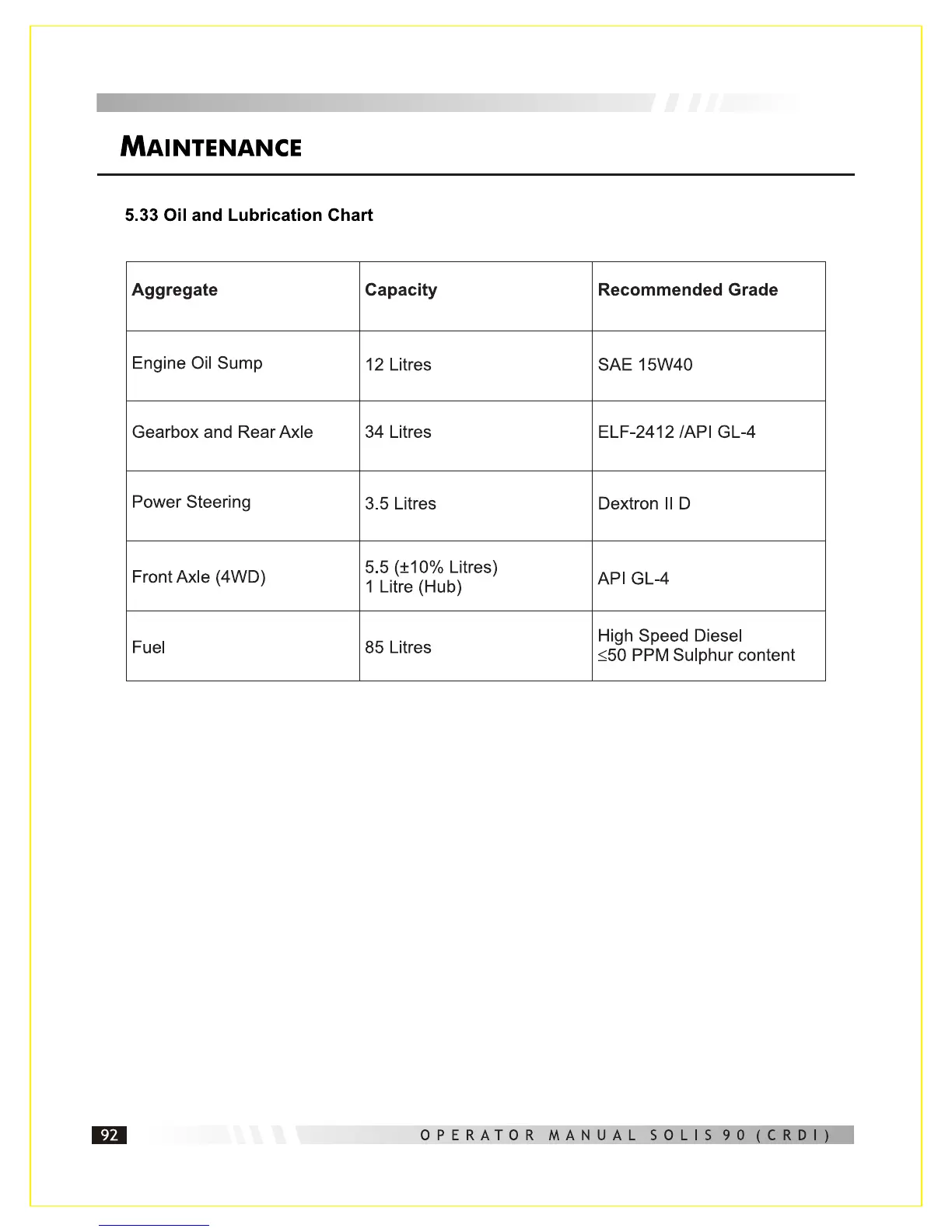 SOLIS 90 CRDI - Oil and Lubrication Chart
