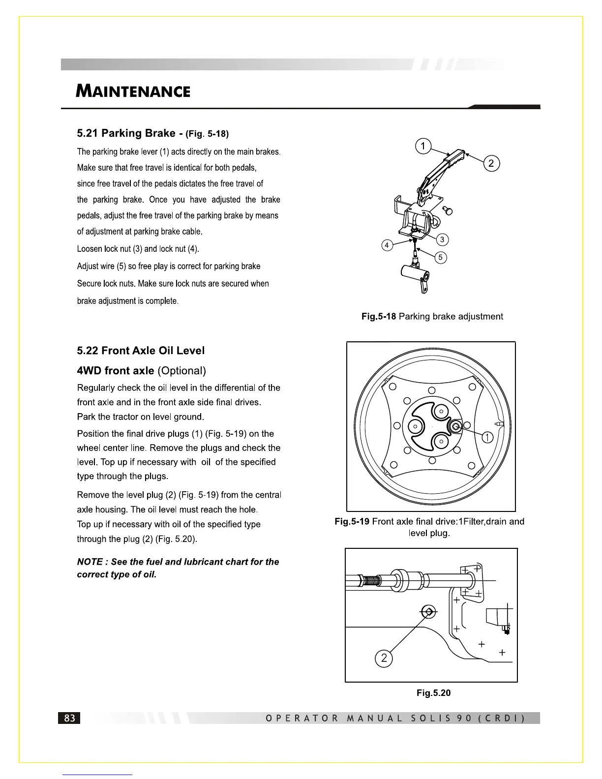 SOLIS 90 - Parking Brake Maintenance; Front Axle Oil Level