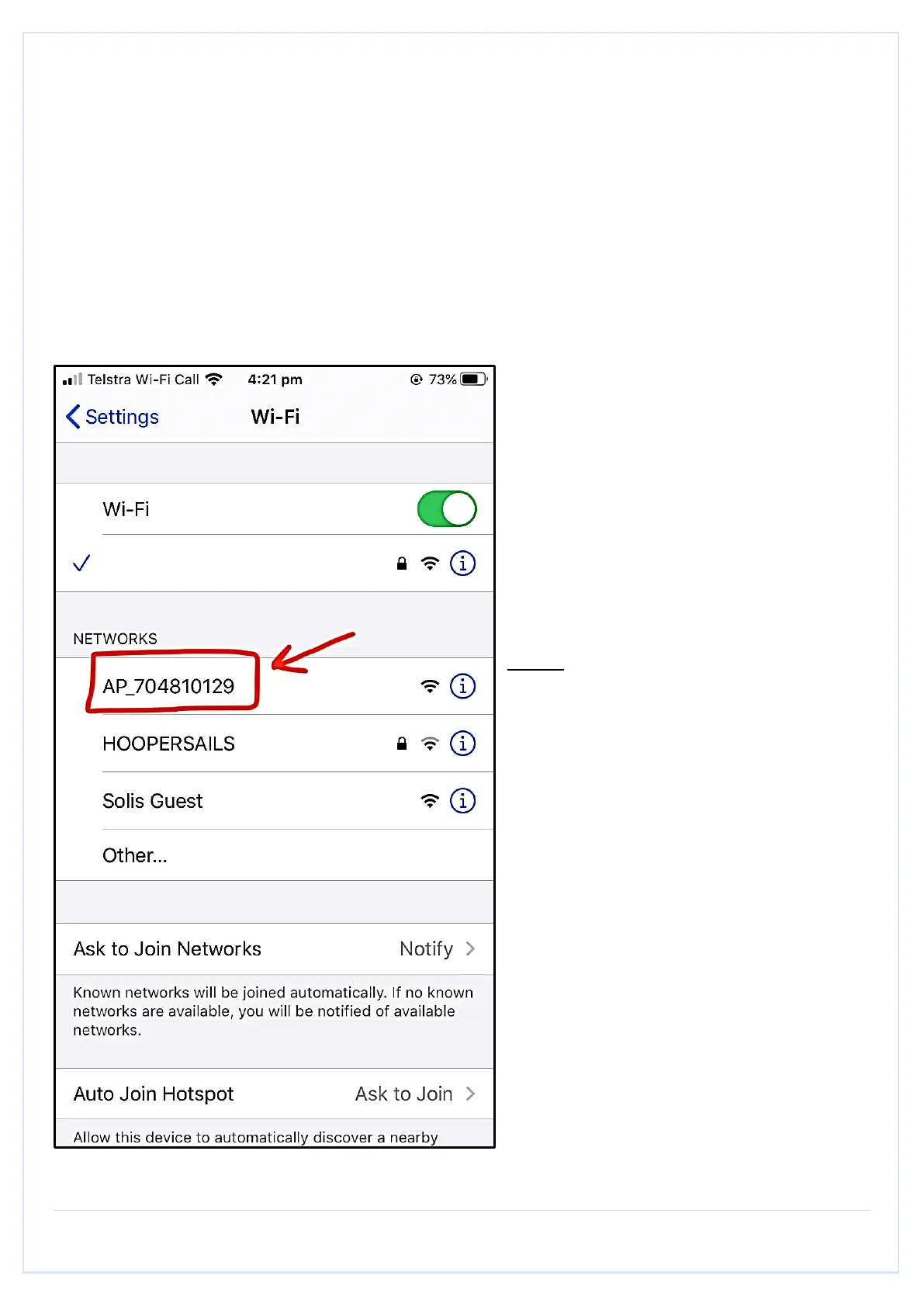 The Solis Wi-Fi dongle will show up as a Wi-Fi network (AP XXXXXXXXXX) in your available