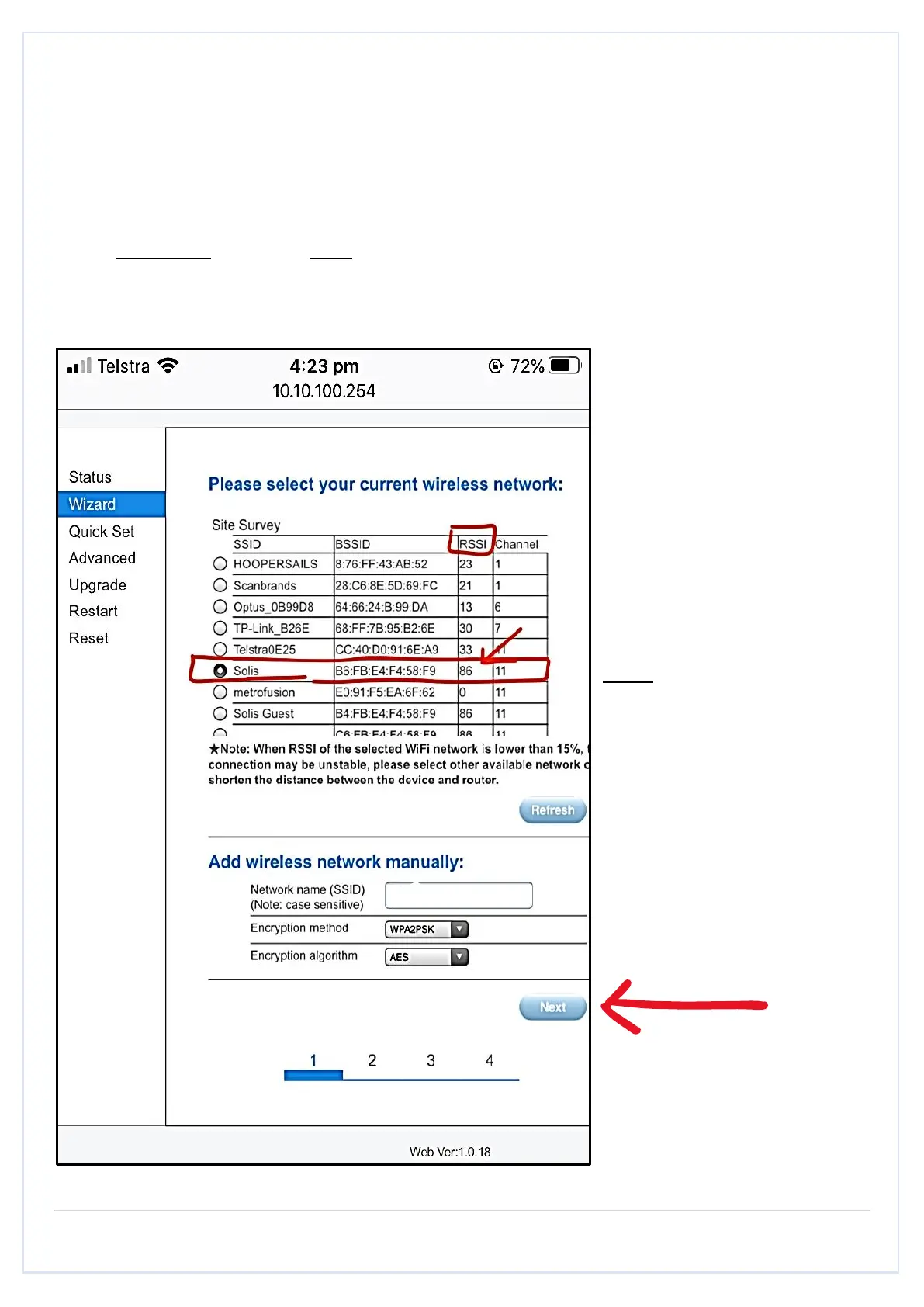 RSSI is more than 30%. Click Next once you have selected your network.