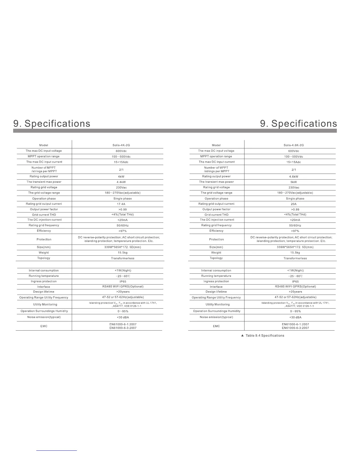 SOLIS Single Phase Inverter - 9.4 Solis 4 K-2 G and 4.6 K-2 G Specifications