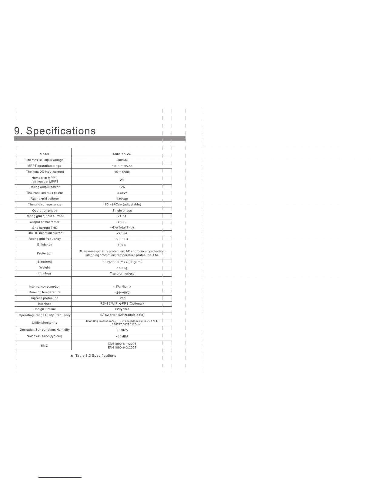 SOLIS Single Phase Inverter - 9.5 Solis 5 K-2 G Specifications