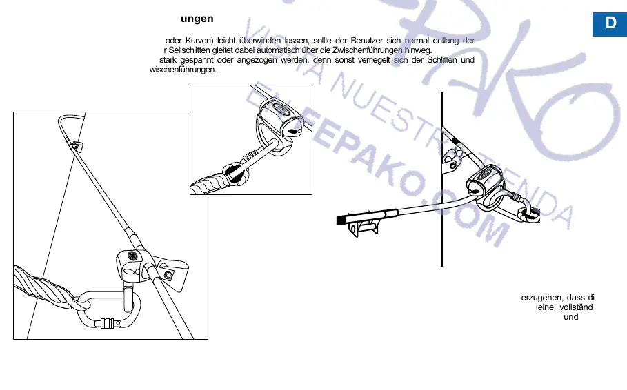 Lebenssicherungsleine bewegen ; der Seilschlitten gleitet dabei automatisch über die Zwischenführungen hinweg.