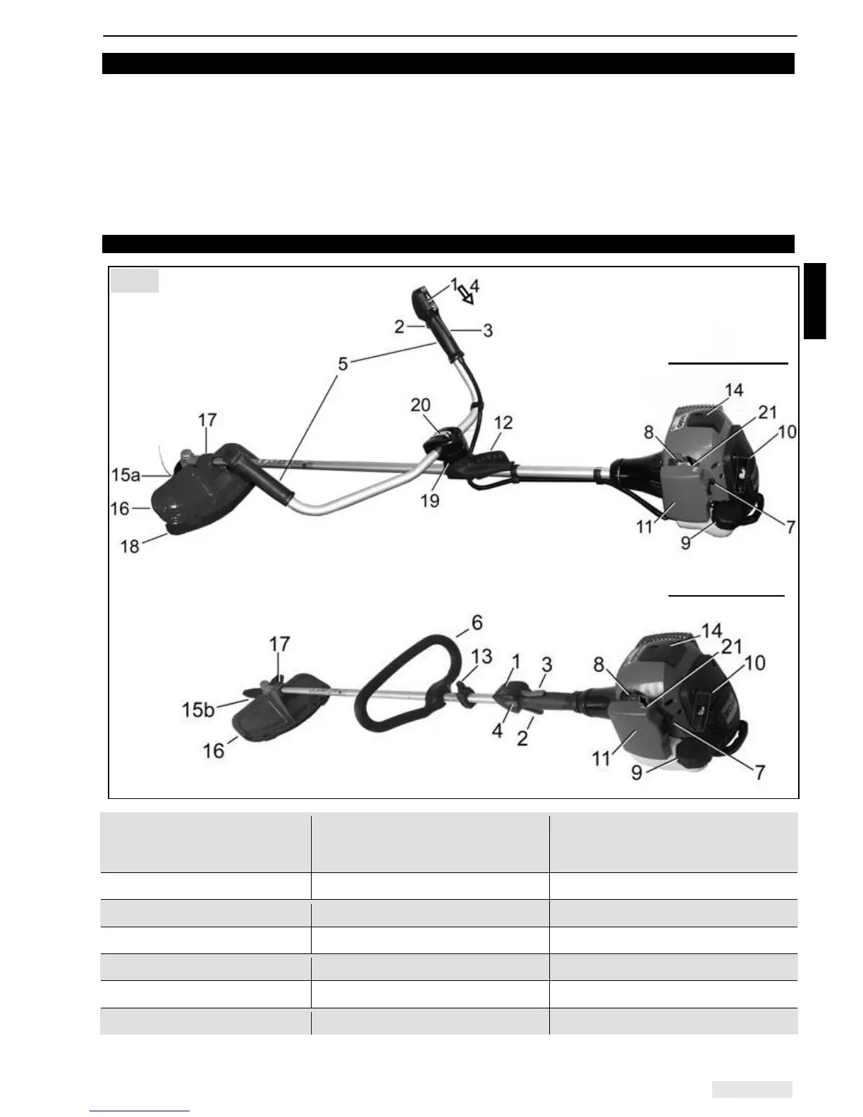• Brushcutter partially assembled; the following components are supplied separately and require assembly