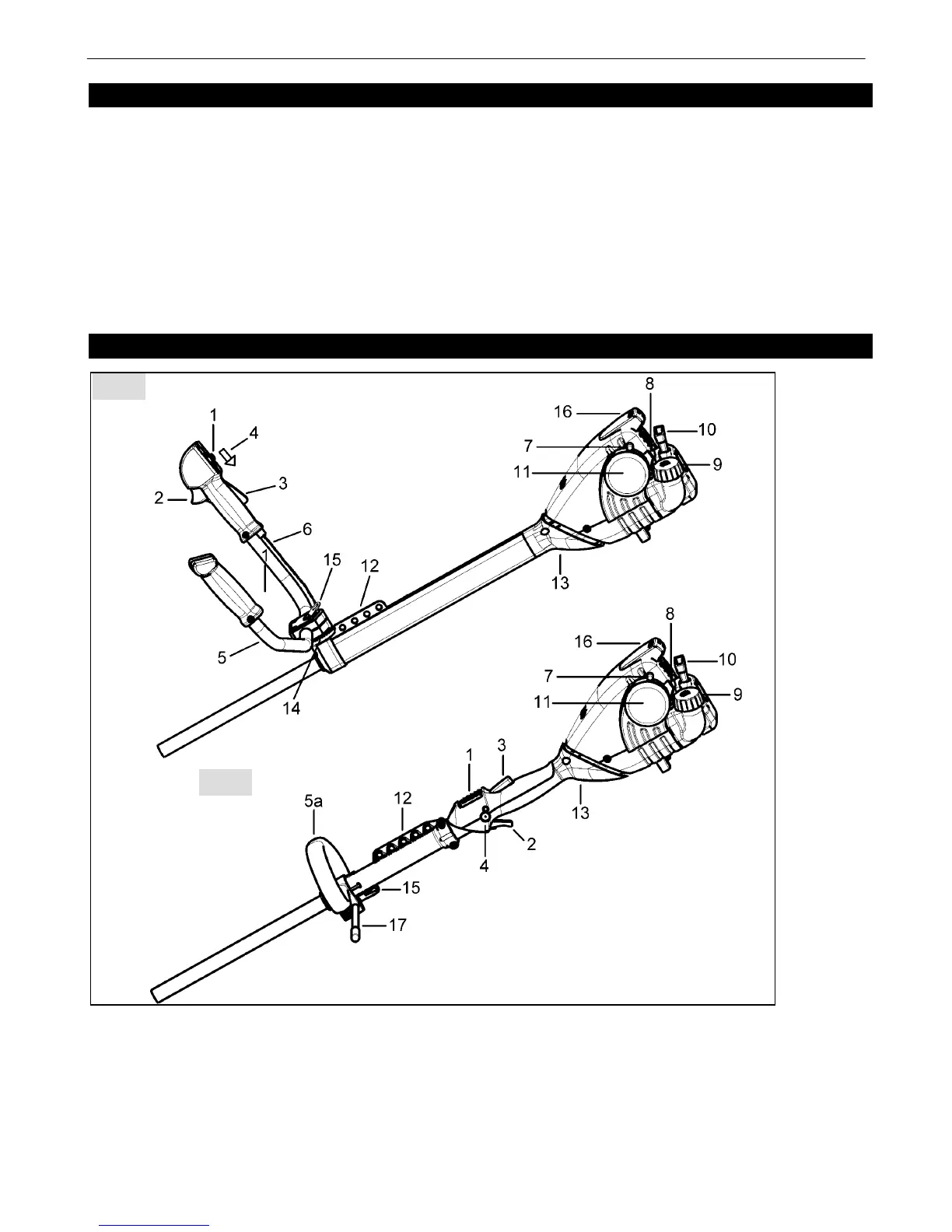 • Brushcutter partially assembled; the following components are supplied separately and require assembly