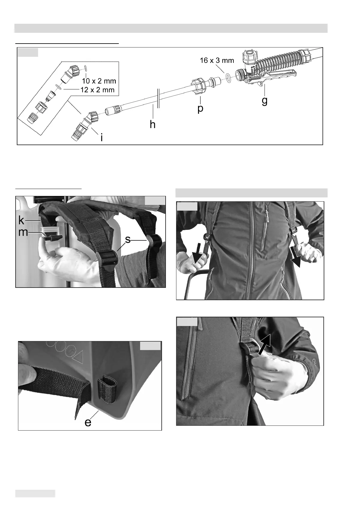 Start the cap nut (p) evenly and screw the spray tube with the O-ring (16x3 mm) onto the hand valve (g)