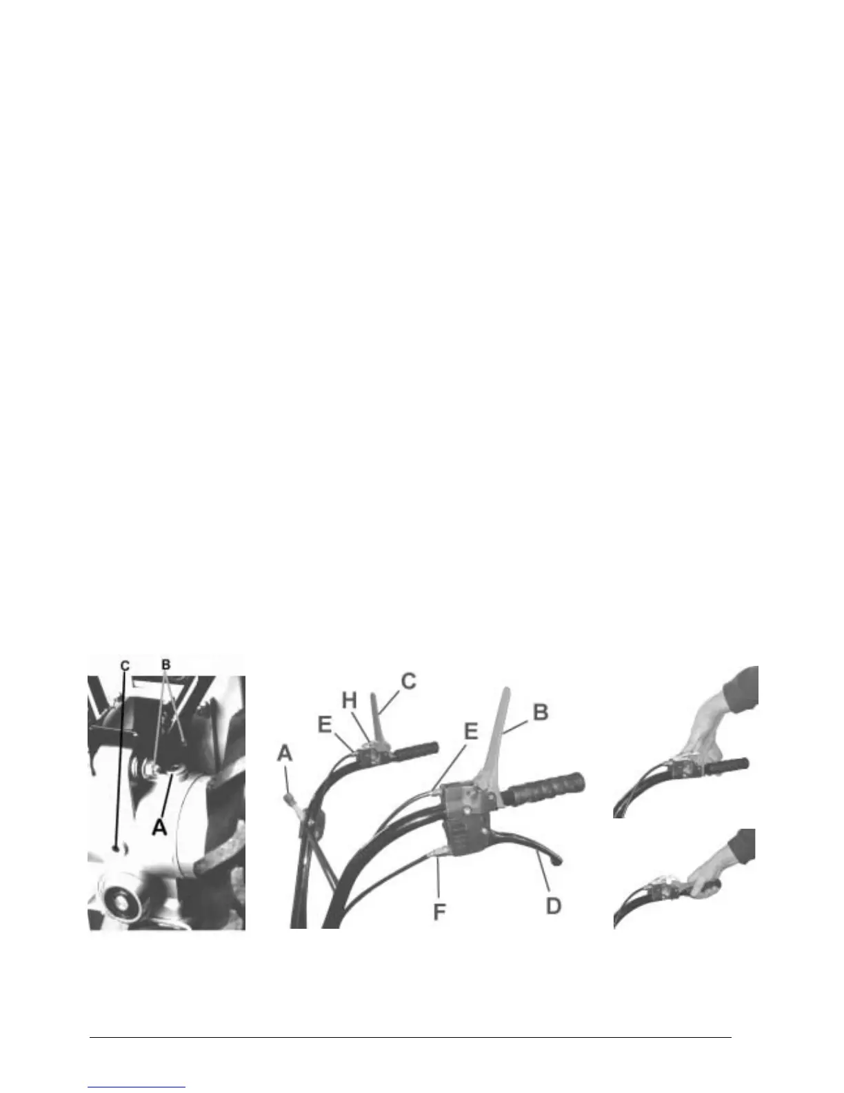 • WICHTIG: Der Bedienungshebel Fahrantrieb (B) und der Kupplungshebel für Freilaufstellung (D) dürfen