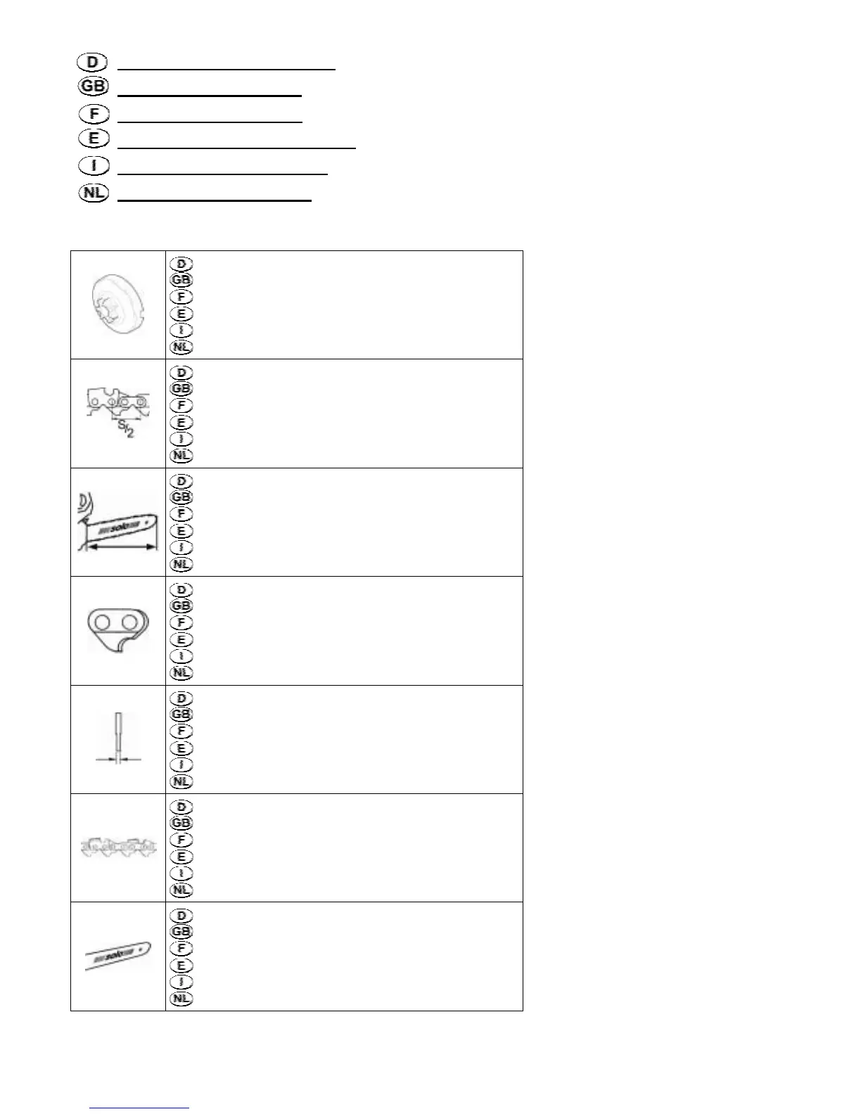 Solo 635 - Permissible Cutting Gear; Component Identification Symbols; Sprocket and Chain Identification Numbers; Cutting Length and Chain Specifications