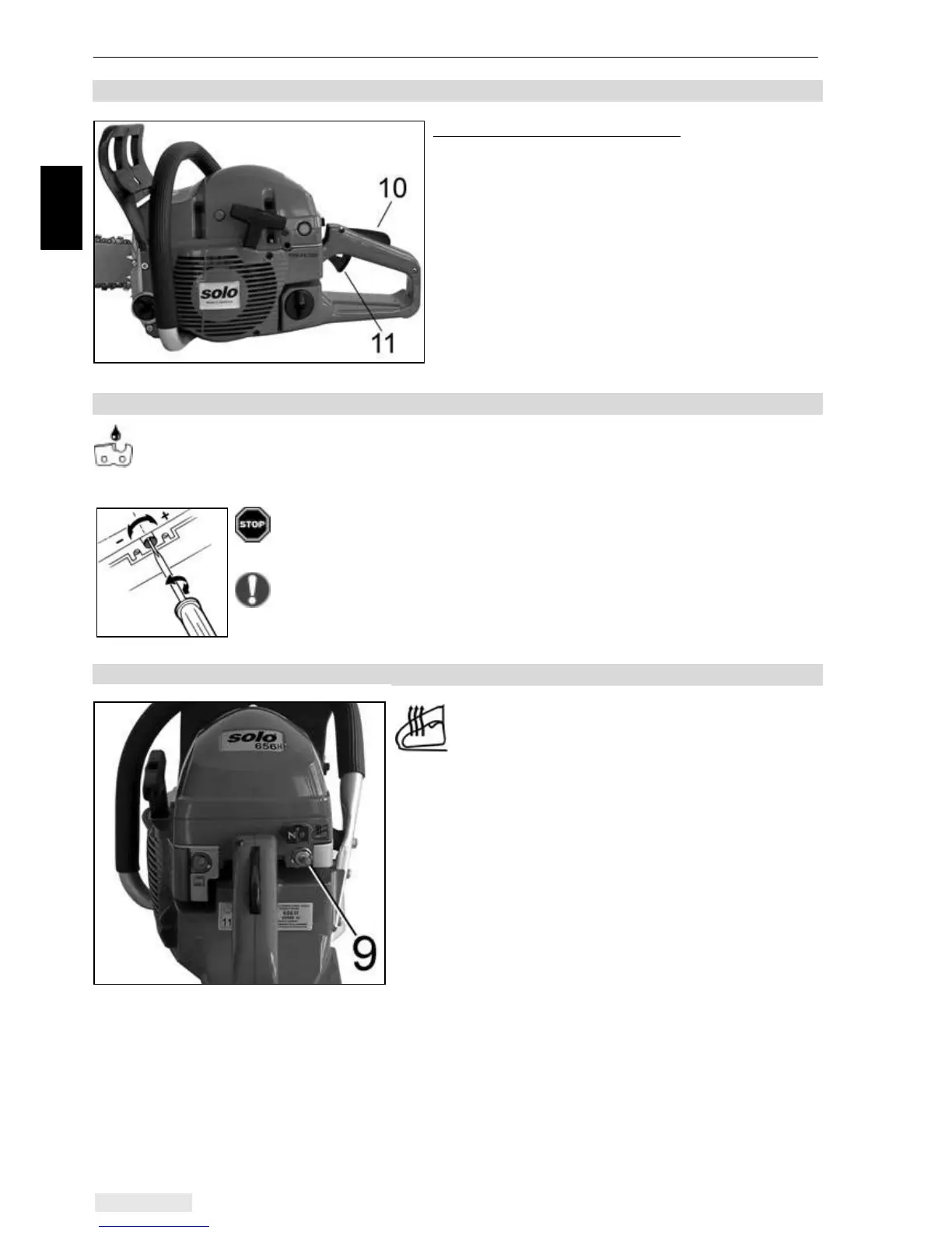 Your SOLO chainsaw - Throttle control lock and throttle control, - Chain lubrication adjusting screw,