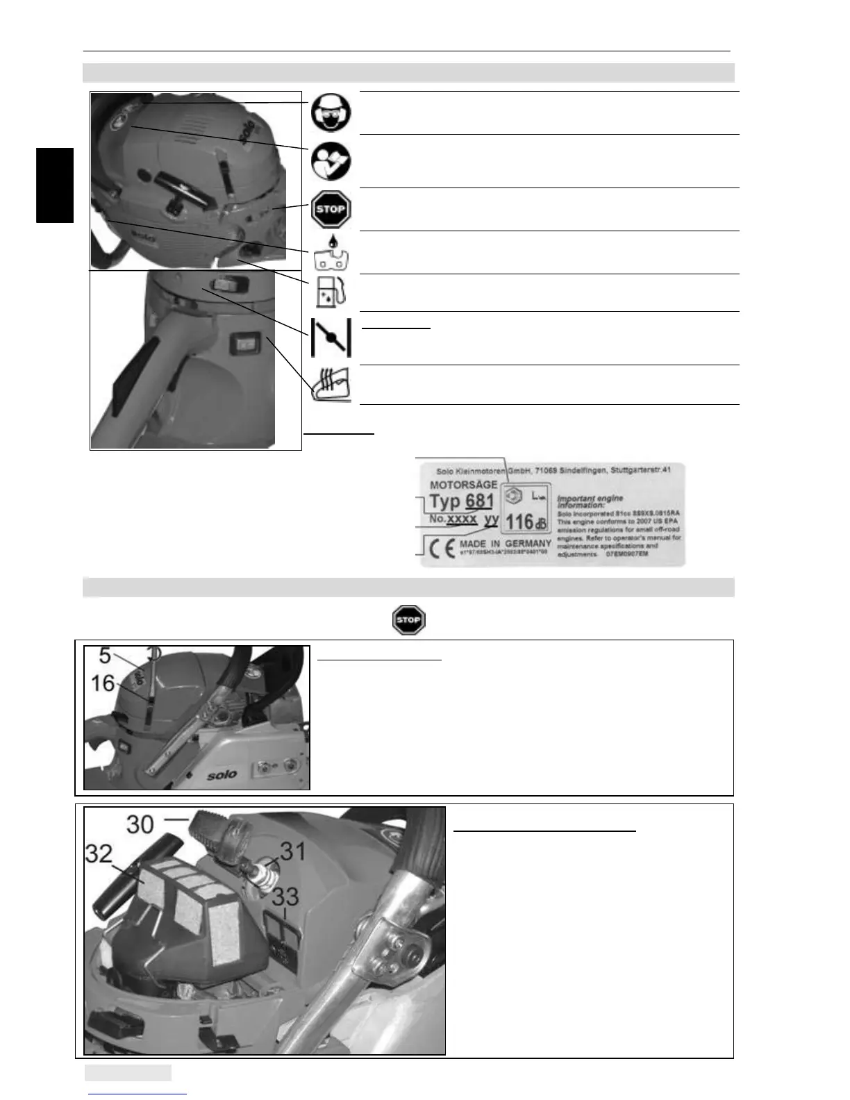 Your SOLO chainsaw - Symbols on the equipment and on the type plate,