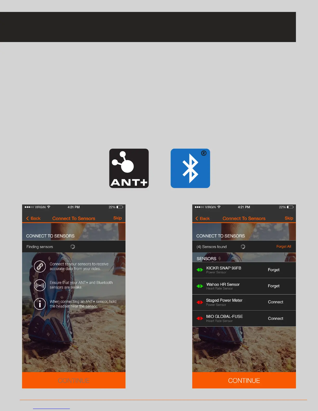 • The app will automatically search for nearby BLE or ANT+ sensors