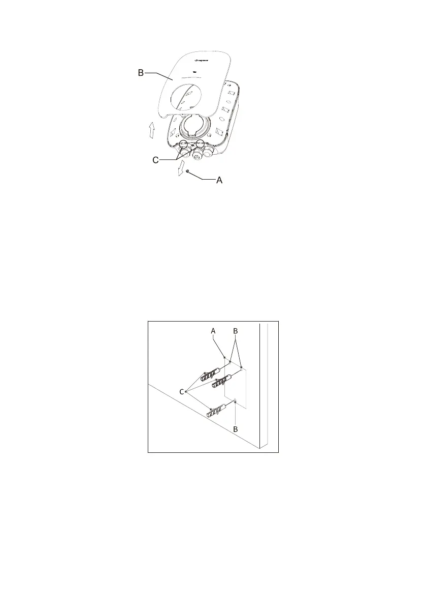 4. Insert the wall plugs (C) into the mounting holes (B).
