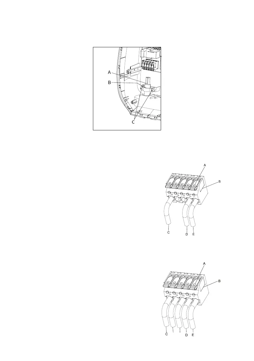 3. Secure the cables (A) with the cable clip (B). Install the two screws (C) to