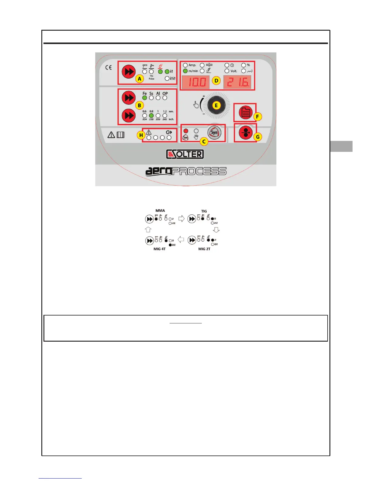 A- Selector del tipo de soldadura: Nos permite seleccionar entre los diferentes tipos de soldadura del equipo. El se-